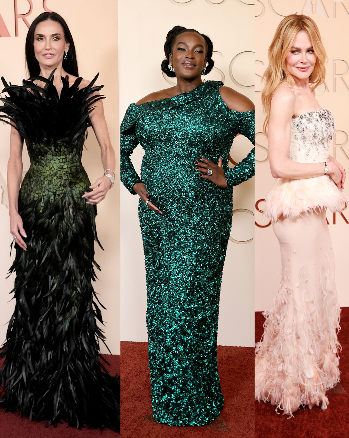 There is nothing understated or subtle about the showgirl trend – it clearly shouts, “Look at me!” Teyana Taylor, nominated for a best supporting actress in One Battle After Another opted for a Matthieu Blazy Chanel black sequined, sheer bodice that fell into dense featherwork at the hem in a classic cinematic palette. Following the theme, Nicole Kidman’s pale pink gown had more than a nod to old Hollywood glamour. The strapless, column-style dress, again by Chanel, featured a soft band of pale blush feathers that formed a peplum finishing in feather appliqué at the hem. The actress, styled by Jason Bolden, wasn’t the only A-lister embracing the trend: Demi Moore wore Gucci, featuring a plume of long black feathers at the bodice that fused with glossy green feathers cinching at the waist. Mikey Madison’s Dior red velvet strapless dress had Moulin Rogue energy – but the real dazzle of this trend came from Wunmi Mosaku’s money-green sequin number, by Nicolas Ghesquière’s Louis Vuitton.