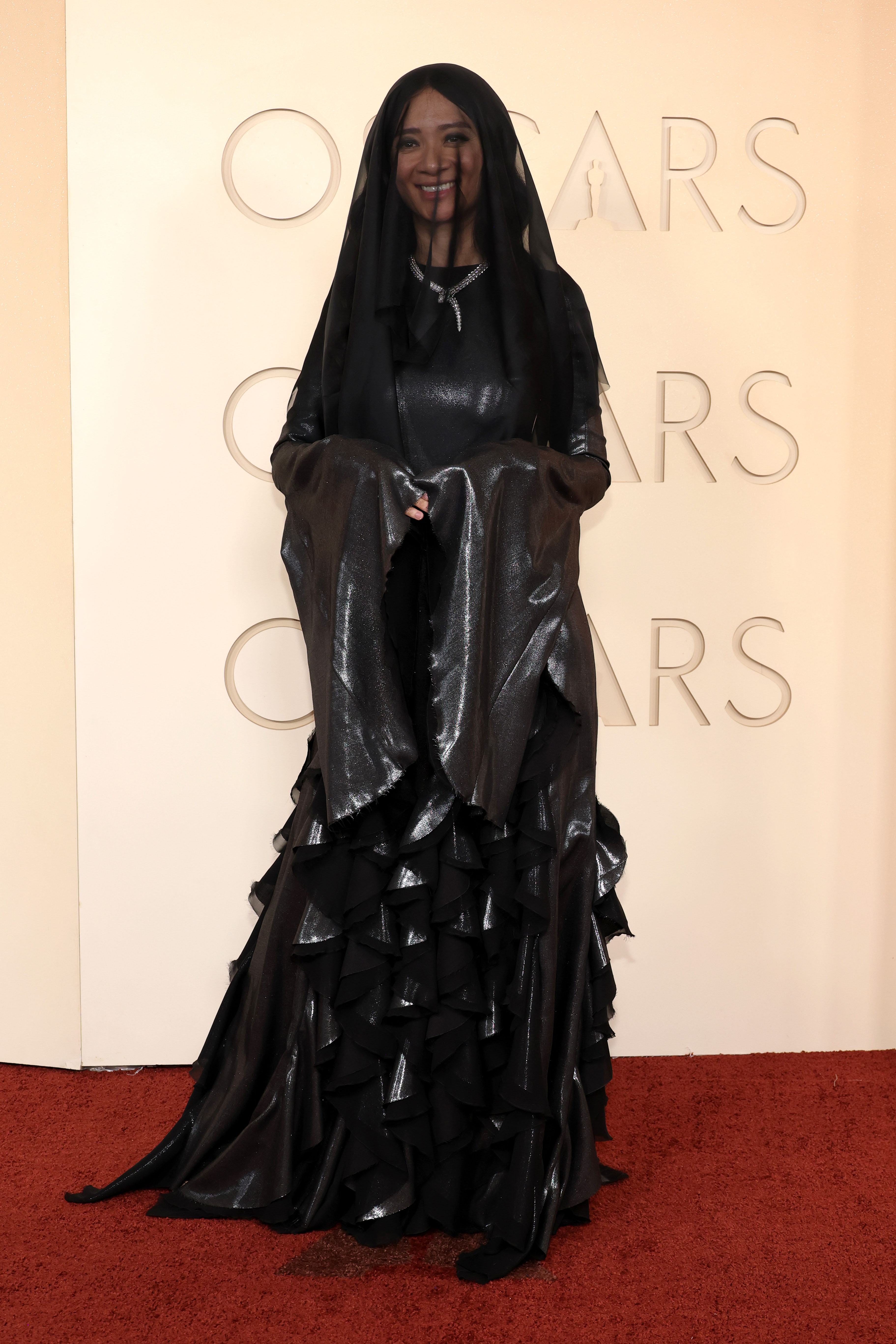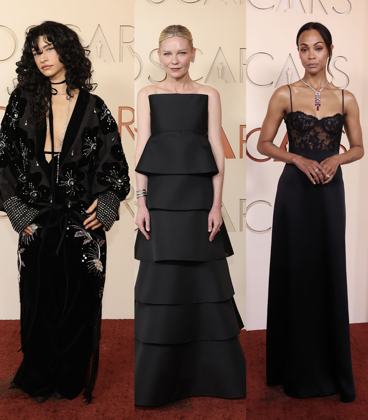 Jet-black dresses remain, as they always have, as a red carpet fail safe look. However, these offerings boasted immaculate tailoring and painstaking detailing to stand out from other black dresses. Chloé Zhao’s black veiled bell sleeves with a tiered skirt, by Gabriela Hearst, seemed to have had a Marmite effect. Personally, we liked the extreme take: Kirsten Dunst played the classic card with her Celine tiered dress, which was understated and elegant. Odessa A’zion opted for detail with a bohemian black crystal embroidered Valentino jacket and fringed skirt, while Zoe Saldana’s femme fatale lace number, by Saint Laurent’s Anthony Vaccarello, added a 30s film noir touch to the red carpet.