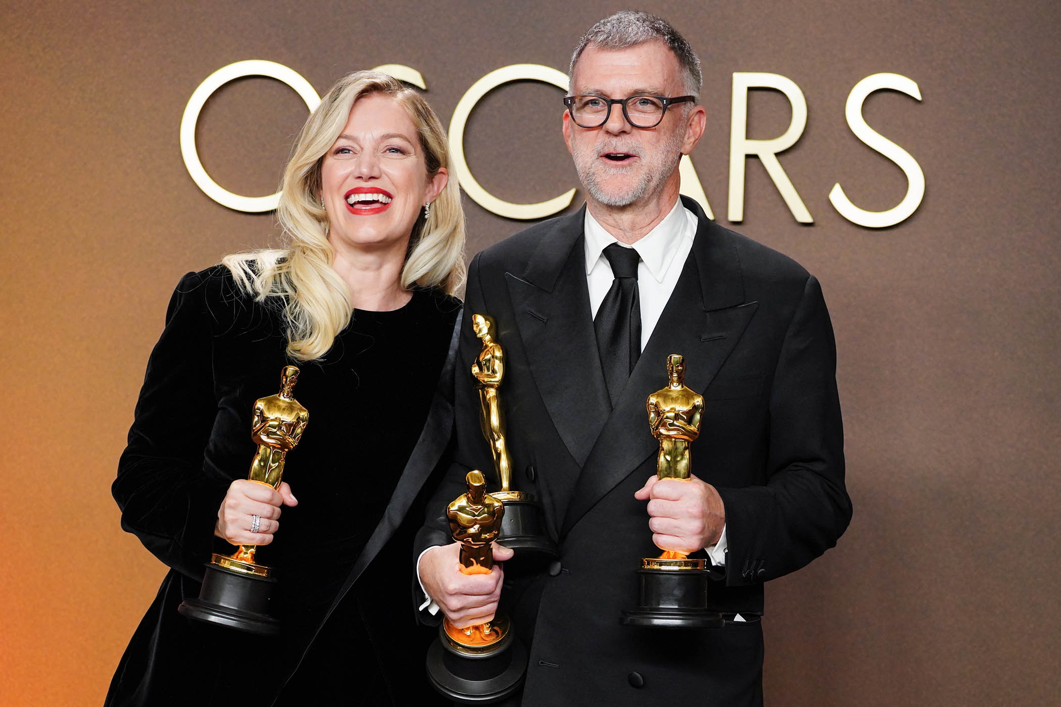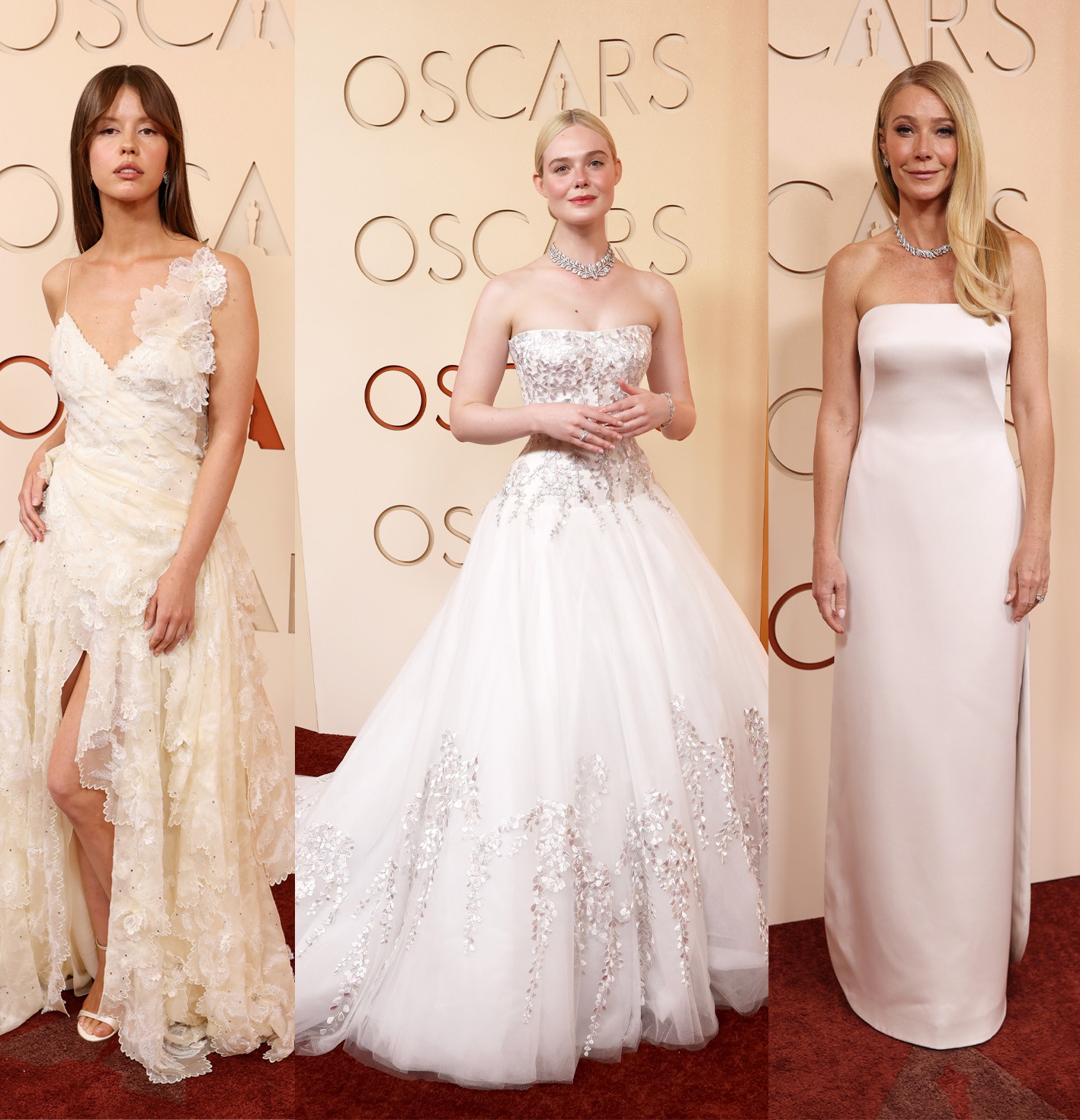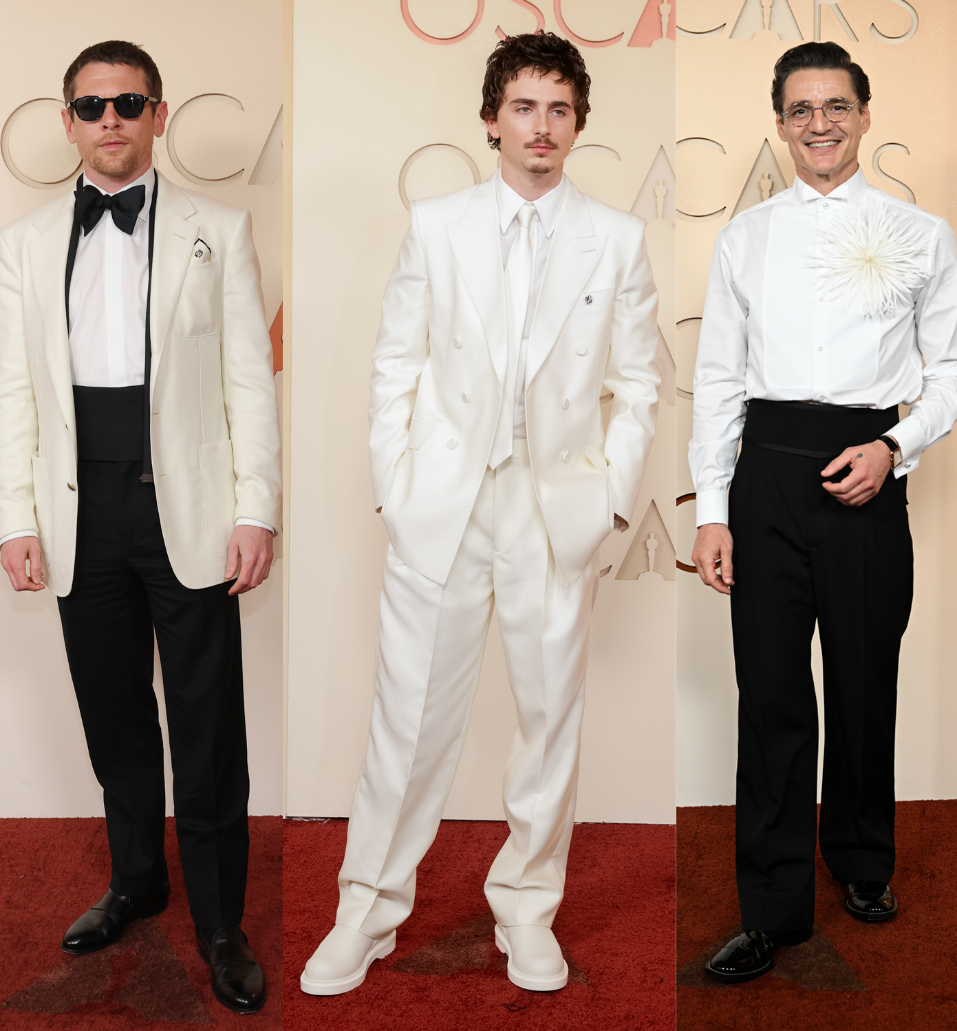 White was one of the big trends of the evening – across both women’s and menswear. Best actress nominee Emma Stone wore a backless beaded Louis Vuitton dress that took 600 hours to make. Pedro Pascal did away with jackets, choosing a white shirt with a huge camellia brooch from Chanel. As expected Timothée Chalamet wore Givenchy by Sarah Burton. Gwyneth Paltrow’s white column Armani Privé dress with naked-look side panels was one of the night’s most daring looks. Paltrow has form with white Oscars dresses: in 1996 she wore a beaded Calvin Klein slip dress, and in 2012 a Tom Ford cape dress. The prize for most original accessory went to Sinners star Jack O’Connell, who wore his Dunhill tuxedo with prosthetic, blood-soaked fangs.