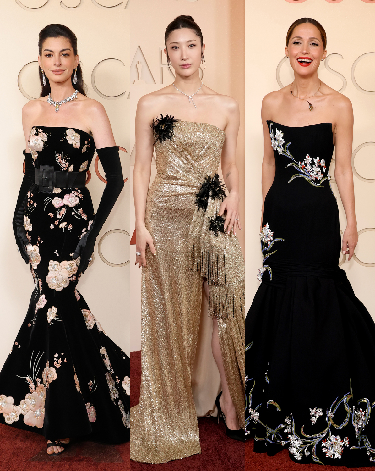 Red carpet dressing often falls into two categories: timeless, elegant codes of the Hollywood Oscars of the 1930s and 40s, sweeping gowns designed to command a staircase entrance; or headline-grabbing personality looks – think Björk’s swan dress and Cher's showgirl number. This season, Anne Hathaway stole the show with a black, strapless Valentino couture gown with floral embellishment and full train worn with opera gloves. Rose Byrne and Ejae, the voice of Rumi in the Netflix animated film K-Pop: Demon Hunters, both chose Dior, each cutting a clean silhouette, there was clearly one trend that that dominated this year’s Academy Awards: the award goes to the strapless dress.