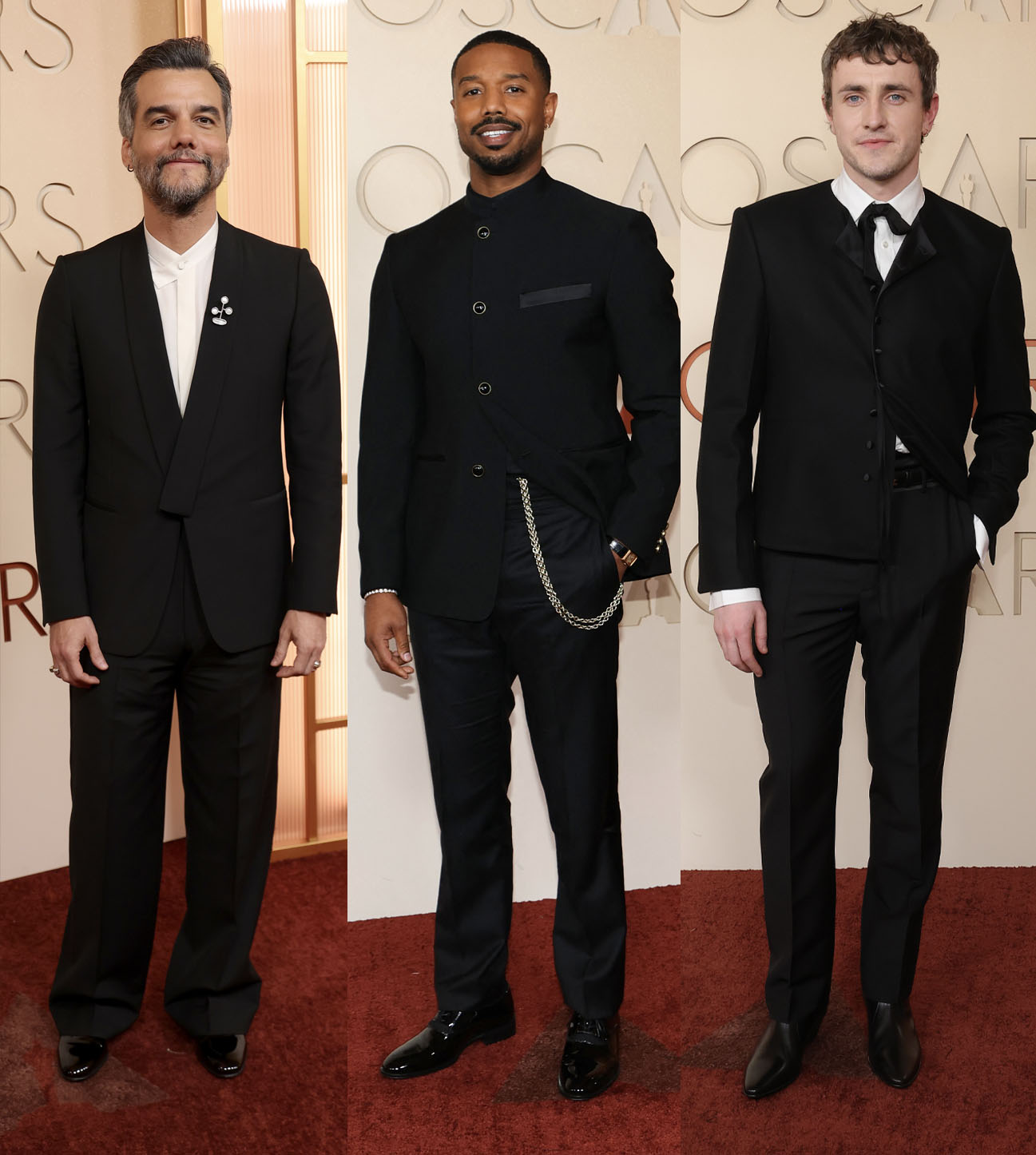 Best actor winner Michael B Jordan was chic personified in custom Louis Vuitton (who also dressed Sinners director and best original screenplay winner, Ryan Coogler). The clean lines of his nehru collar suit with gold chain detail rounded out a flawless awards season from the actor, styled by Jason Bolden. There was a lot of watch action on this carpet (and awkward arm posing to show off said watches) but MBJ’s Piaget protocole deserves a nod. Paul Mescal arrived in a look by Michael Rider for Celine, that GQ dubbed “a flirty cardigan-esque jacket” paired with a ribbon bow tie. Felicity Kay, his long-term stylist, told Esquire: “It’s elegant, with a little sense of being undone. It feels like Paul, but also distinctly different.” Brazilian actor and star of The Secret Agent, Wagner Moura, completed the hat-trick for the collarless trend with a white Zegna shirt. His look also featured a brooch by Brazilian jeweller André Lasmar, symbolising the branch carried by the dove of peace.