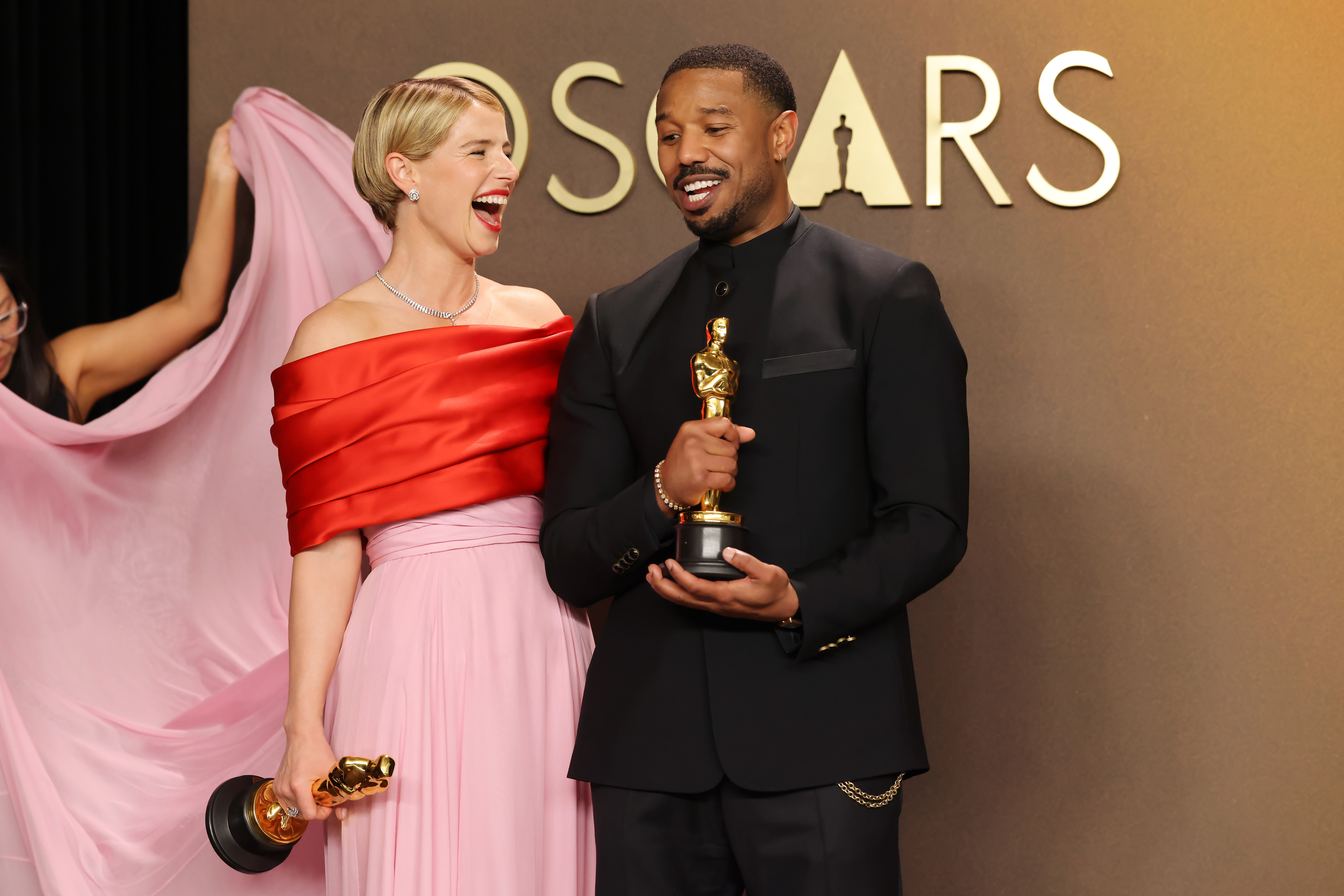 Best actress winner Jessie Buckley’s Chanel floor-skimming baby-pink gown with an off-the-shoulder wrap neckline in contrasting red was inspired by Grace Kelly’s 1956 Oscar’s dress. Buckley’s stylist, Danielle Goldberg, helped the actress build a friendship with Chanel creative director Matthieu Blazy – a man she described to Vogue as “a singular vibrant artist”. Kate Hudson, who was nominated for best actress for her performance in Song Sung Blue chose her pale mint-green Armani Privé gown with a sweetheart neckline and peplum detail on the morning of the ceremony. Chase Infiniti, who stars as Willa in Paul Thomas Anderson’s One Battle After Another wore a ruffled a lilac gown by Louis Vuitton’s Nicolas Ghesquière. The asymmetric layers of silk, rumoured to have taken over 750 hours to make, draped to one side, creating a dramatic train as she walked the red carpet. The pastel trend was sealed by Felicity Jones’s pale lemon Prada dress and McKenna Grace's pale pink Vera Wang ball gown.