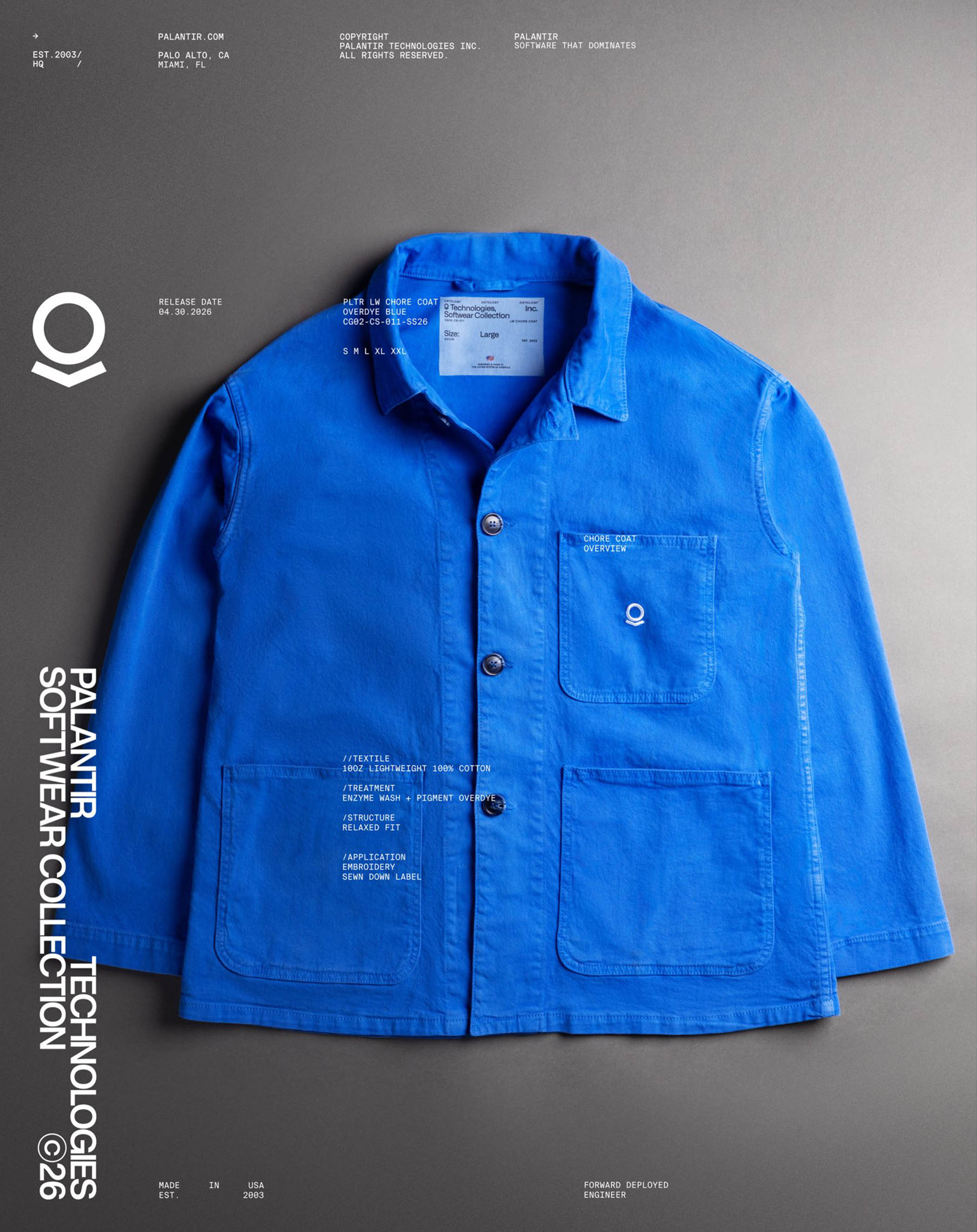 Palantir’s iteration stays true to the late-19th-century French origins of the three-pocket bleu de travail developed for farm and factory workers, made from thick, durable cotton moleskin, and which gave birth to the term “blue collar workers”.