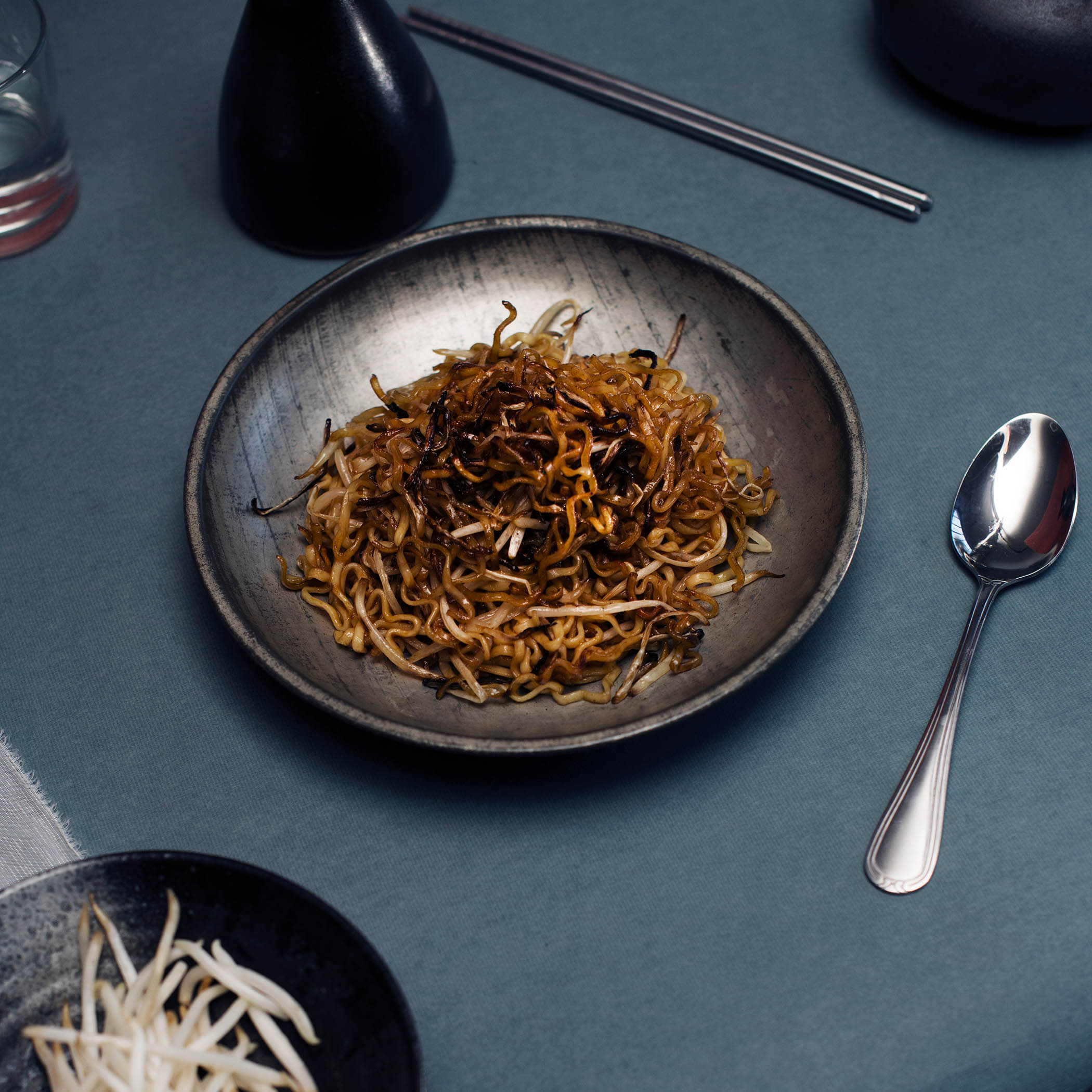 This is an unbelievably simple dish that my Japanese mother makes often. It is almost like a really pared-back yakisoba, and I love it because it is so quick and satisfying. The key here is good bean sprouts. You need more of these than of the noodles themselves, and this is where a lot of the flavour comes from. There’s not a lot else to hide behind, so make sure they are really fresh. My mother likes to spend the time picking off the tiny roots at the bottom of every single sprout (she says they are bitter). If you have the patience to do this, I must say, it does make a difference.