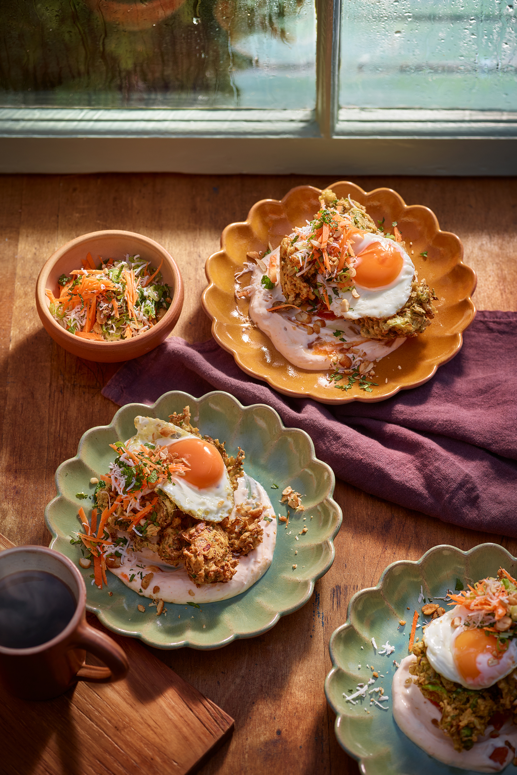 Move over turkey and ham sandwich, this is your new leftover go-to. This recipe is for everyone but especially you, the cook. It gives you time to chill in the kitchen, put on some tunes and escape the in-laws (self care: you’re welcome, guys).The recipe makes enough for four hearty eaters but double it if you have a crowd. You will need to deep fry the pakoras, so preheat your oven to keep them warm, and make them in batches, before adorning with a beautiful fried egg, hot mango pickle yoghurt and a fresh peanut and carrot chutney.