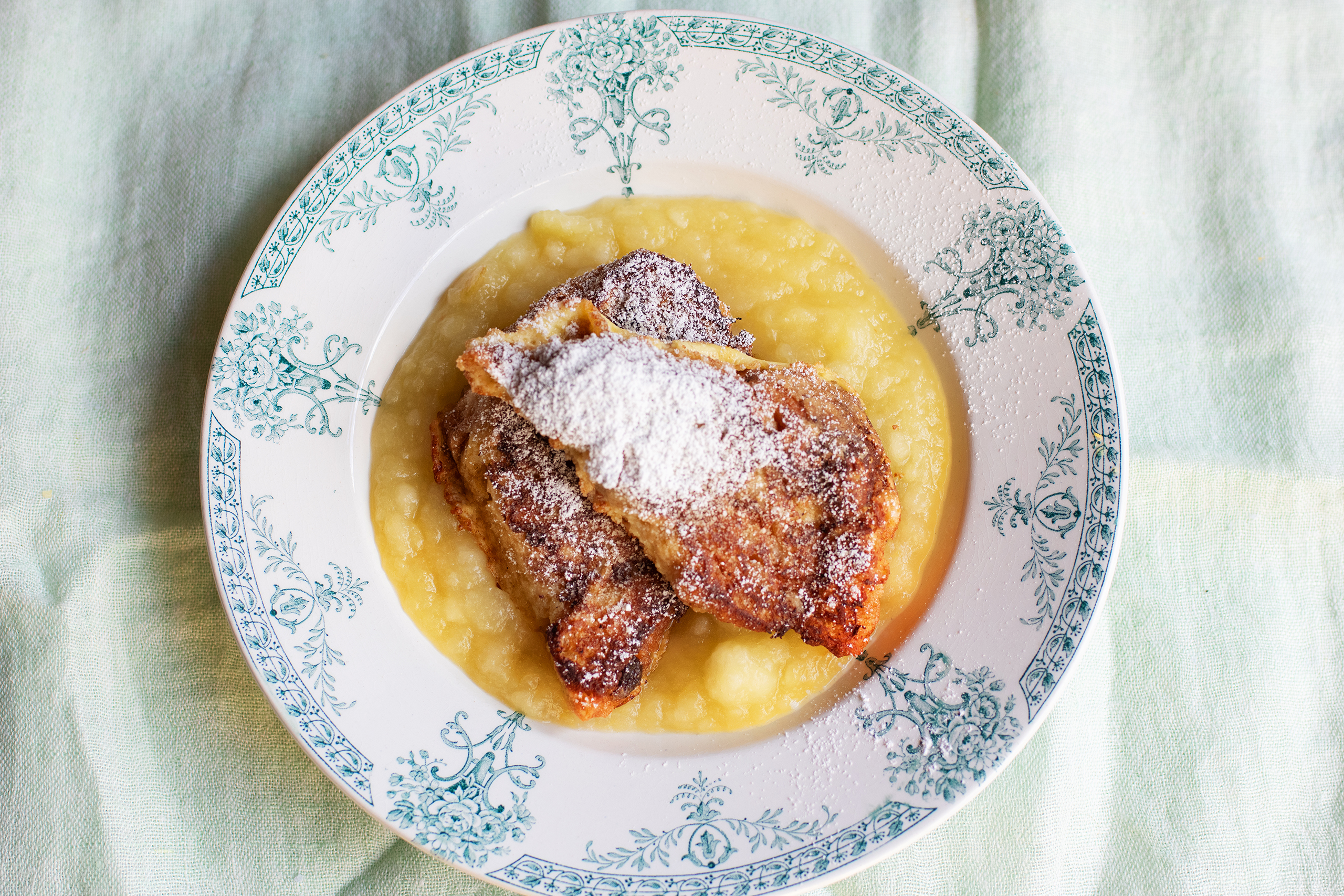 It is a rare moment when my fridge is without a bowl of stewed apple. Whether for eating at breakfast with yoghurt or overnight oats, to add a cool sweet-sharp note to the golden fat of a grilled pork chop or for stirring into cream and custard for a quick apple fool. This week my snowy slush of bramleys got an outing with hot, sugar-dusted panettone as a light version of eggy bread, with hints of vanilla and lemon. You could use brioche in place of the panettone, in which case I would stir a little vanilla paste into the cream.