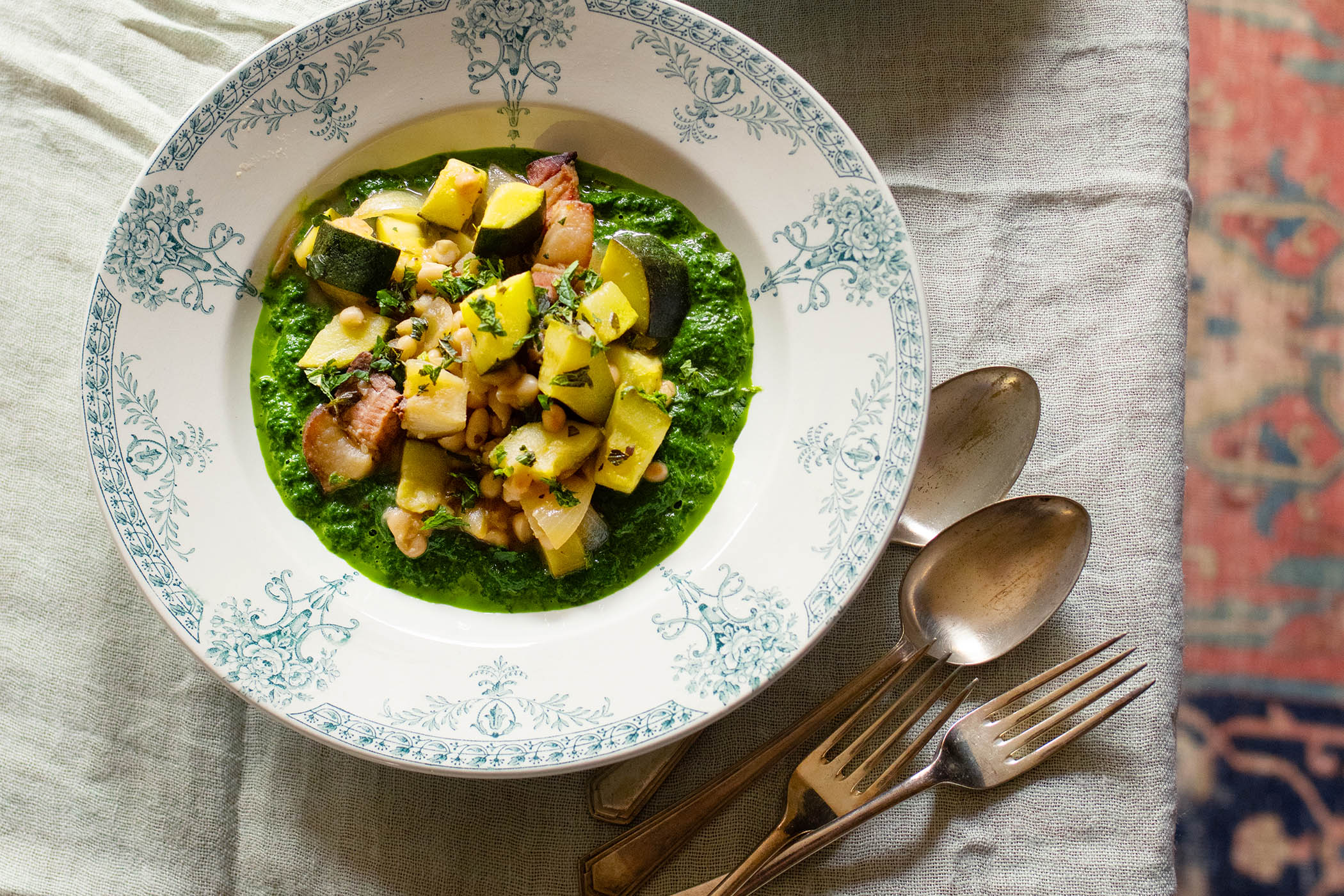 Courgettes, pancetta, haricot and green sauce
