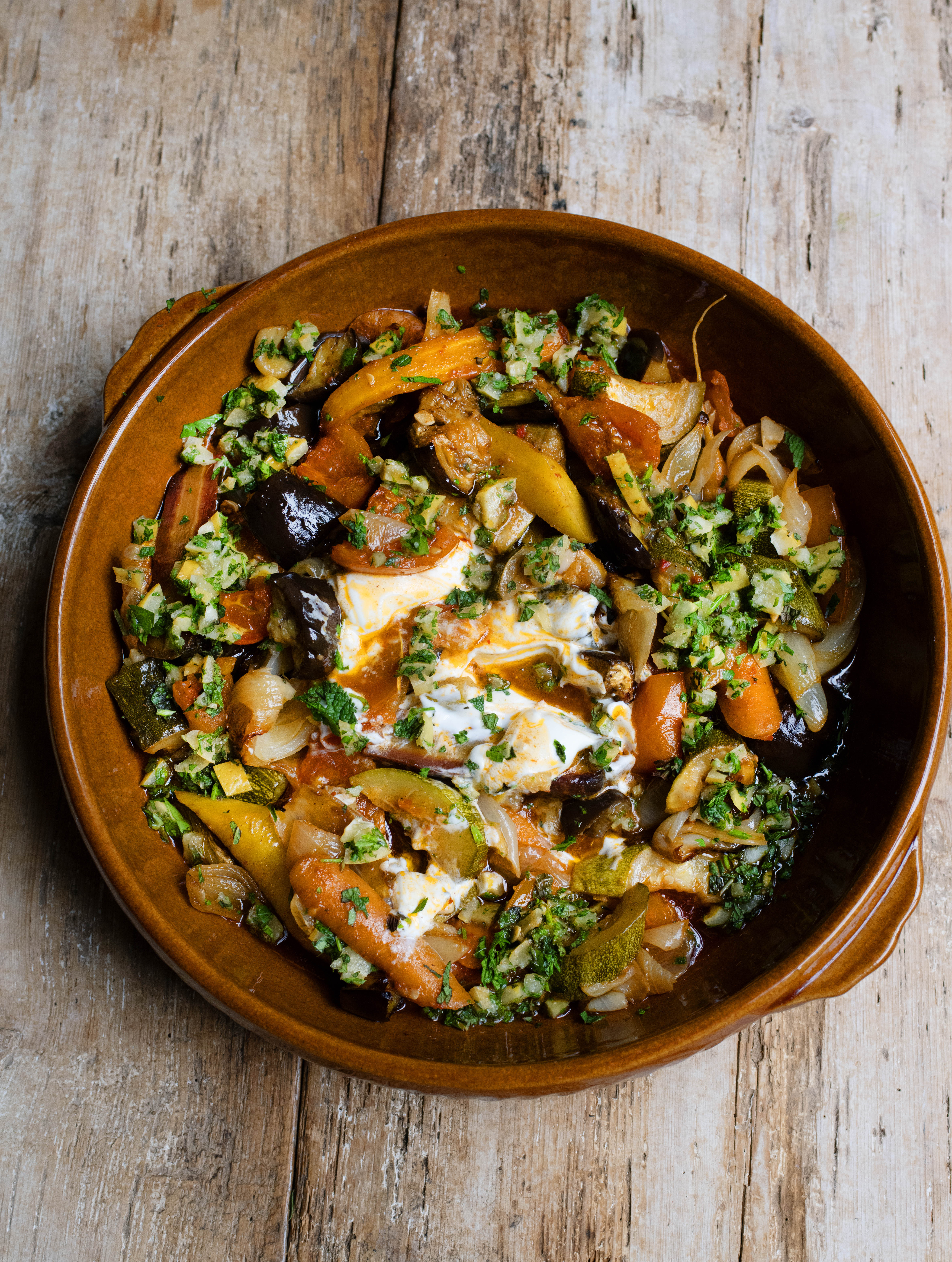 onions 3, mediumaubergines 4, small (or 2 large)olive oil 100mlcourgettes 2tomatoes 500gcarrots 4, slimpreserved lemons 2parsley a small bunchmint leaves 20 mediumstrained yoghurt 150ml (optional)