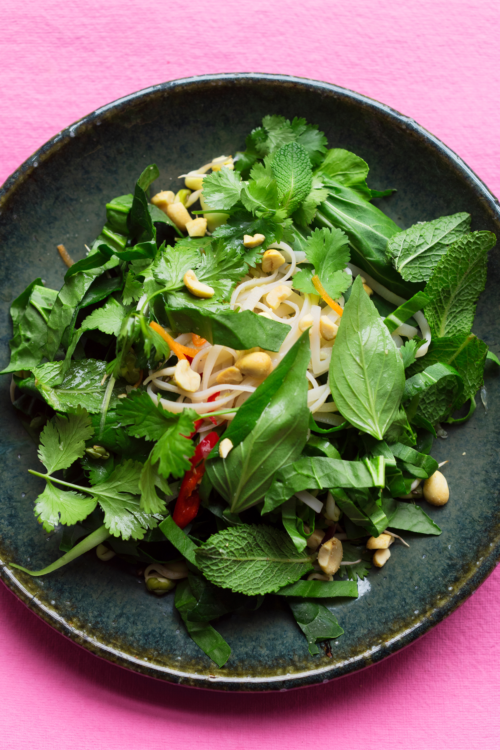 Toss the mung beans, carrot, cucumber, pak choy and herbs together. Drain the noodles and toss with the vegetables and herbs.