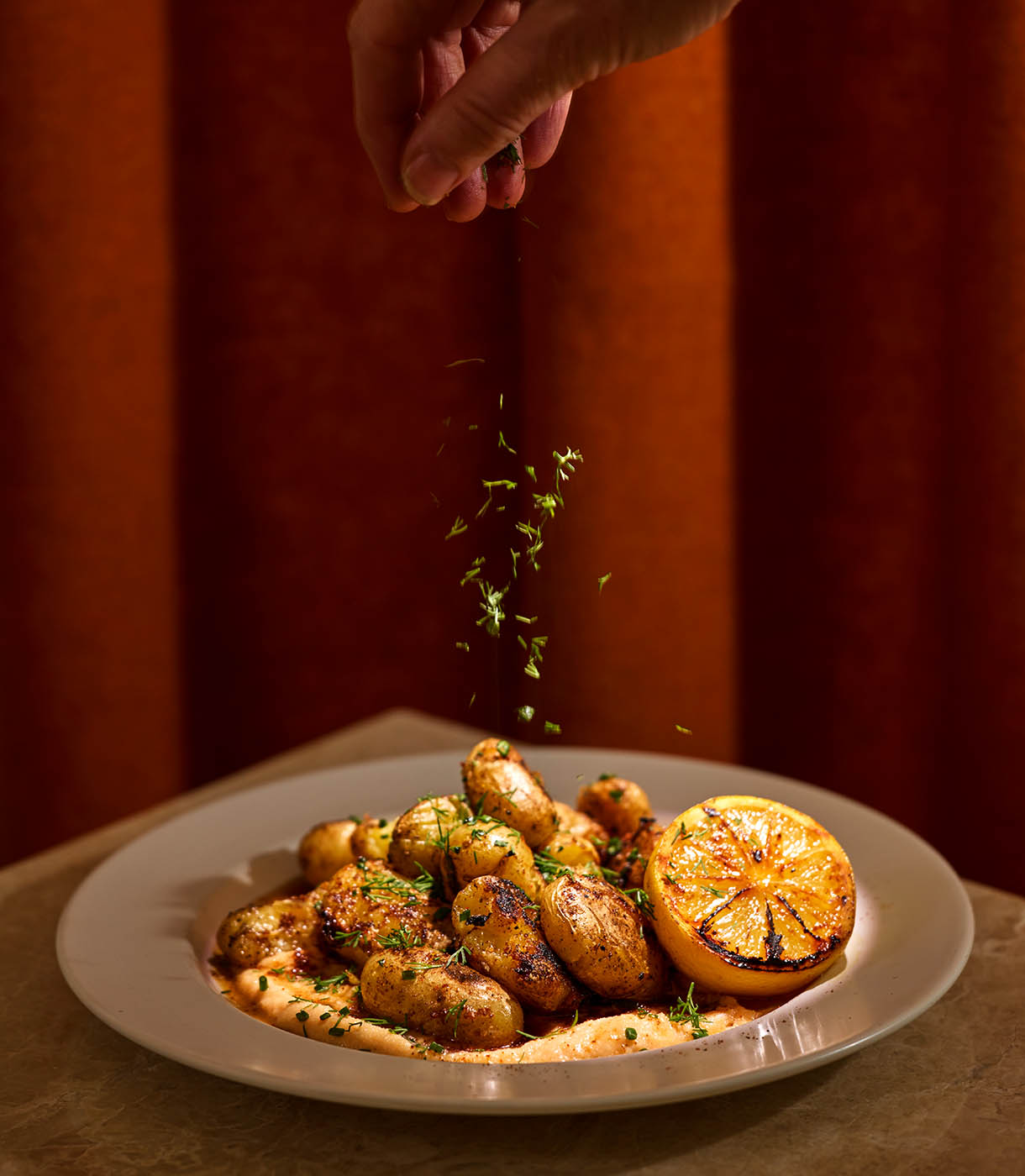 Charred potatoes with smoked roe, brown butter and burnt onion oil