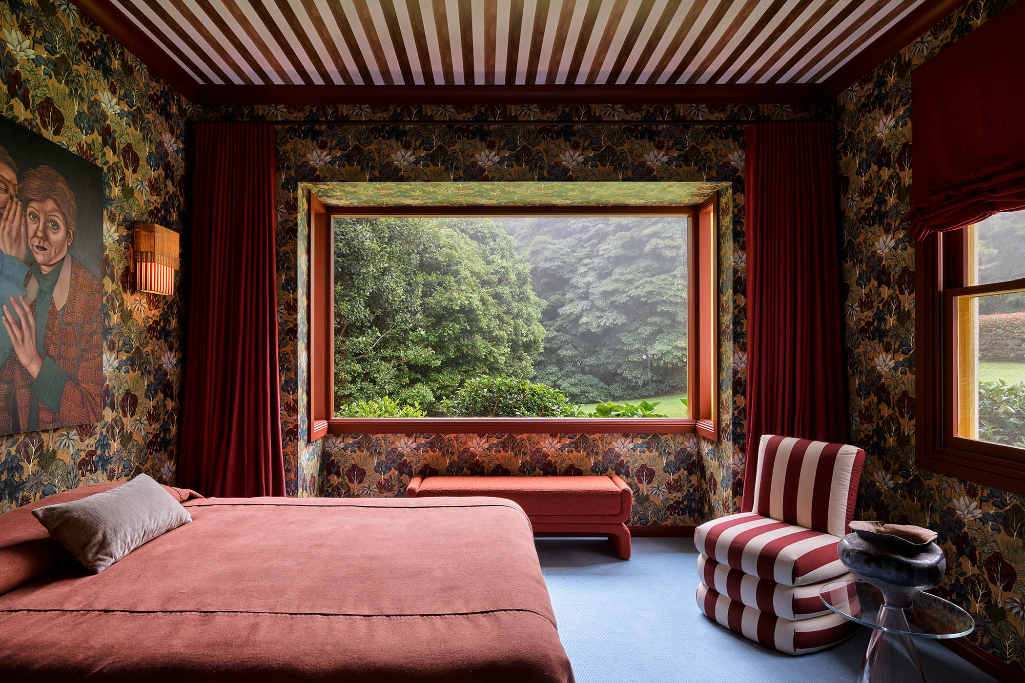 The family didn’t want to embark on any extensive building work, so the refurb was largely cosmetic. No fan of minimalism, Ghoniem took the verdant surroundings of coastal New South Wales as her starting point, dressing the bedrooms in ornate, leafy wallpapers, with more appearing throughout the house in bathrooms and the living spaces. “The wallpapers are there to complement the landscape,” Ghoniem says. “You walk into these little worlds.”