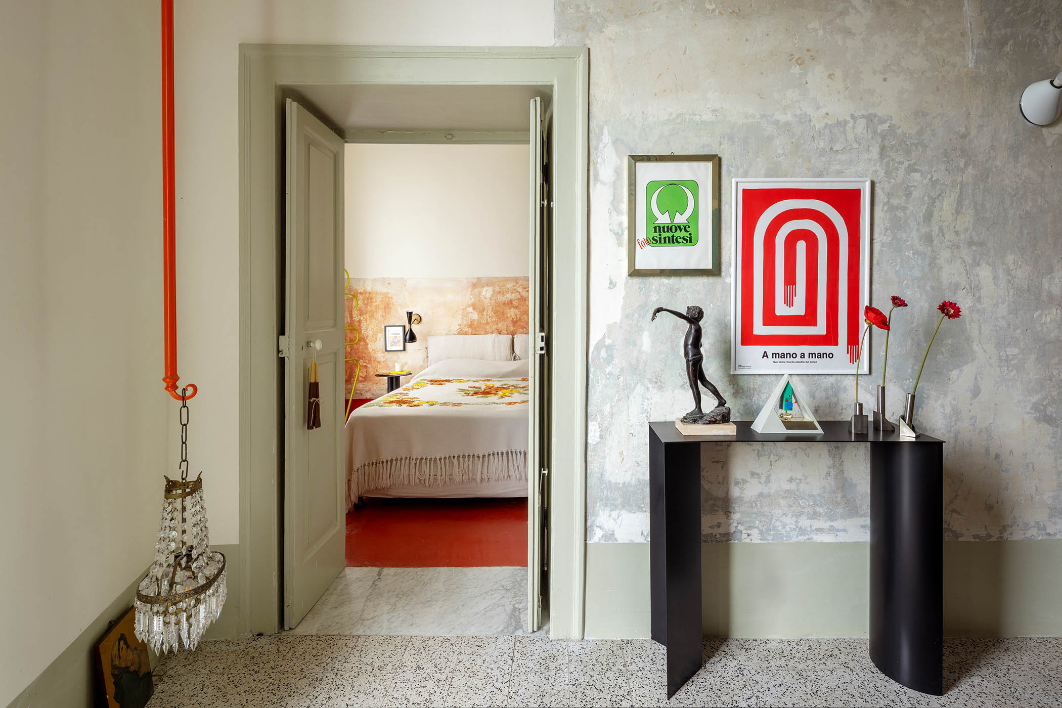 The quiet design details are what create a feeling of cohesion here. When they removed the wallpaper, the couple uncovered the original painted walls (green and blue in the living room, red in the bedroom) and framed the best-preserved portions with fresh plaster. “It immediately became clear that these colours were an integral part of the project, so we adapted the entire mood of the space to these tones to allow them to communicate with one another,” says Punzo, pointing to the red resin floor they poured in the bedroom and the structural beam that divides the living space from the kitchen, which they painted green.