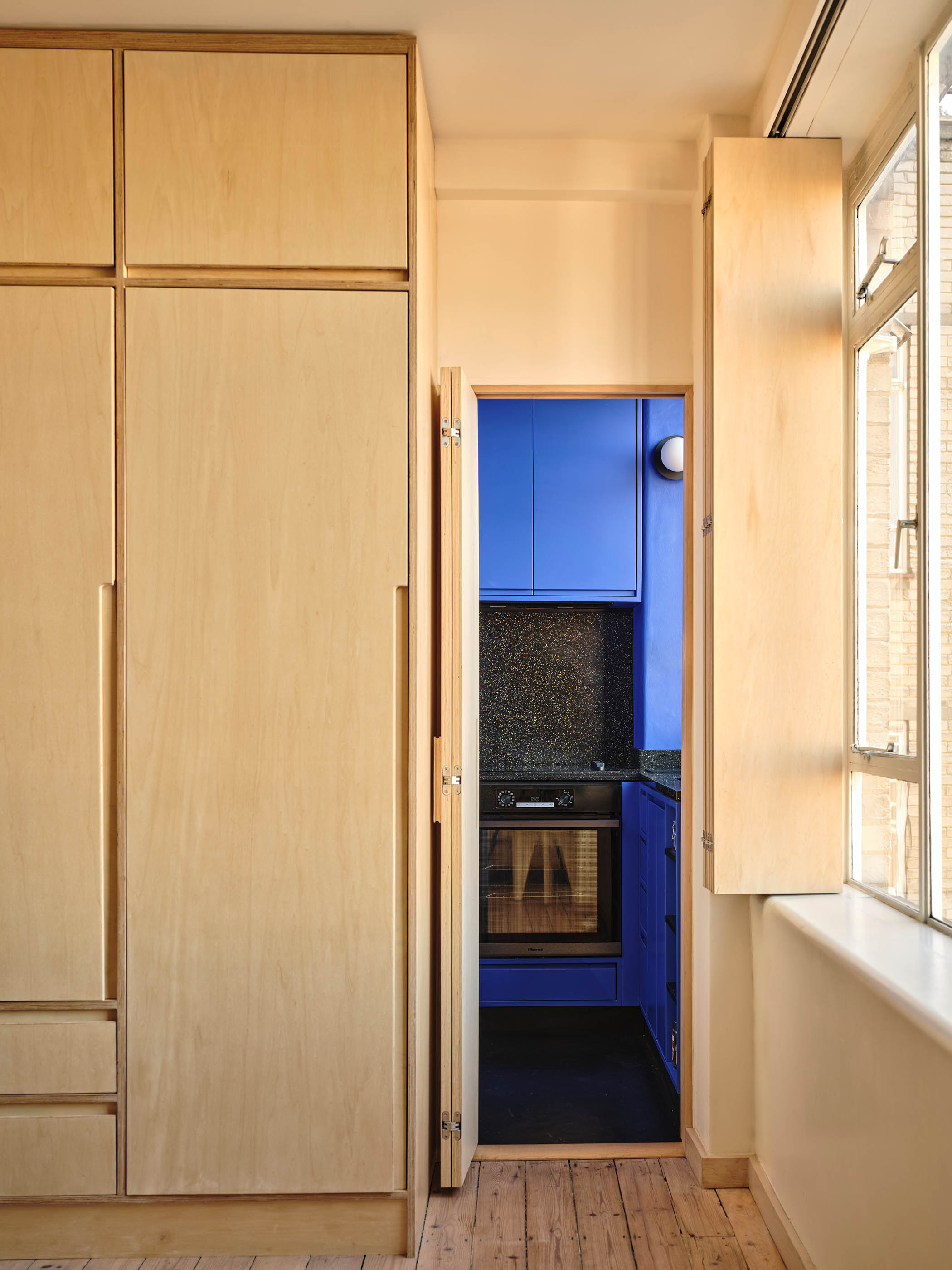 Because of the constraints of the space, Intervention Architecture adopted an unusual technique for the build. All the storage units and furniture were designed for the flat, and the constituent parts were cut out off-site with a CNC machine and transported to the building in flat-pack form. (Florin Court’s titchy Art Deco lift made this approach doubly necessary.) The artist and fabricator Ian Brown, a friend of Baldock and Zajko, then assembled and built everything inside the apartment. “This technique reduced the cost,” says Parker, “but also the amount of material use, so we could get every millimetre out of the timber we were usingd.”