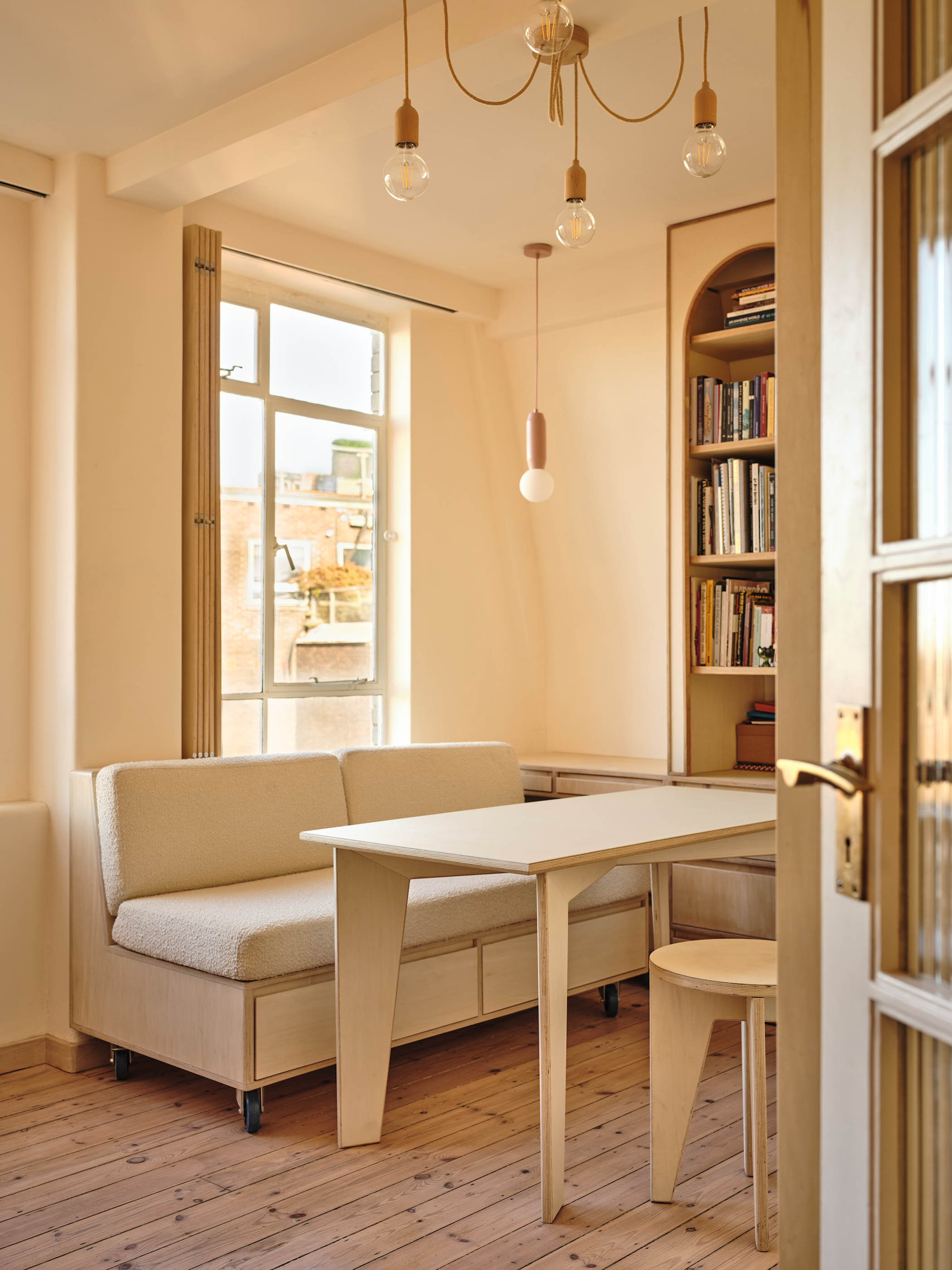 Parker and her team redesigned the flat with adaptability in mind. “Traditional homes can be quite cellular: this is the living room, this is the dining room, this is the workspace,” she says. “Actually, there can be fluidity within a smaller space to create those zones through changeable joinery.” The Murphy bed is the most obvious example of this – when it’s up in the wall, the main room is a dining-cum-living space; when it’s down, it’s transformed into a cosy bedroom. But other elements also make the room multifunctional, such as the sketching desk that lifts up from a sideboard.
