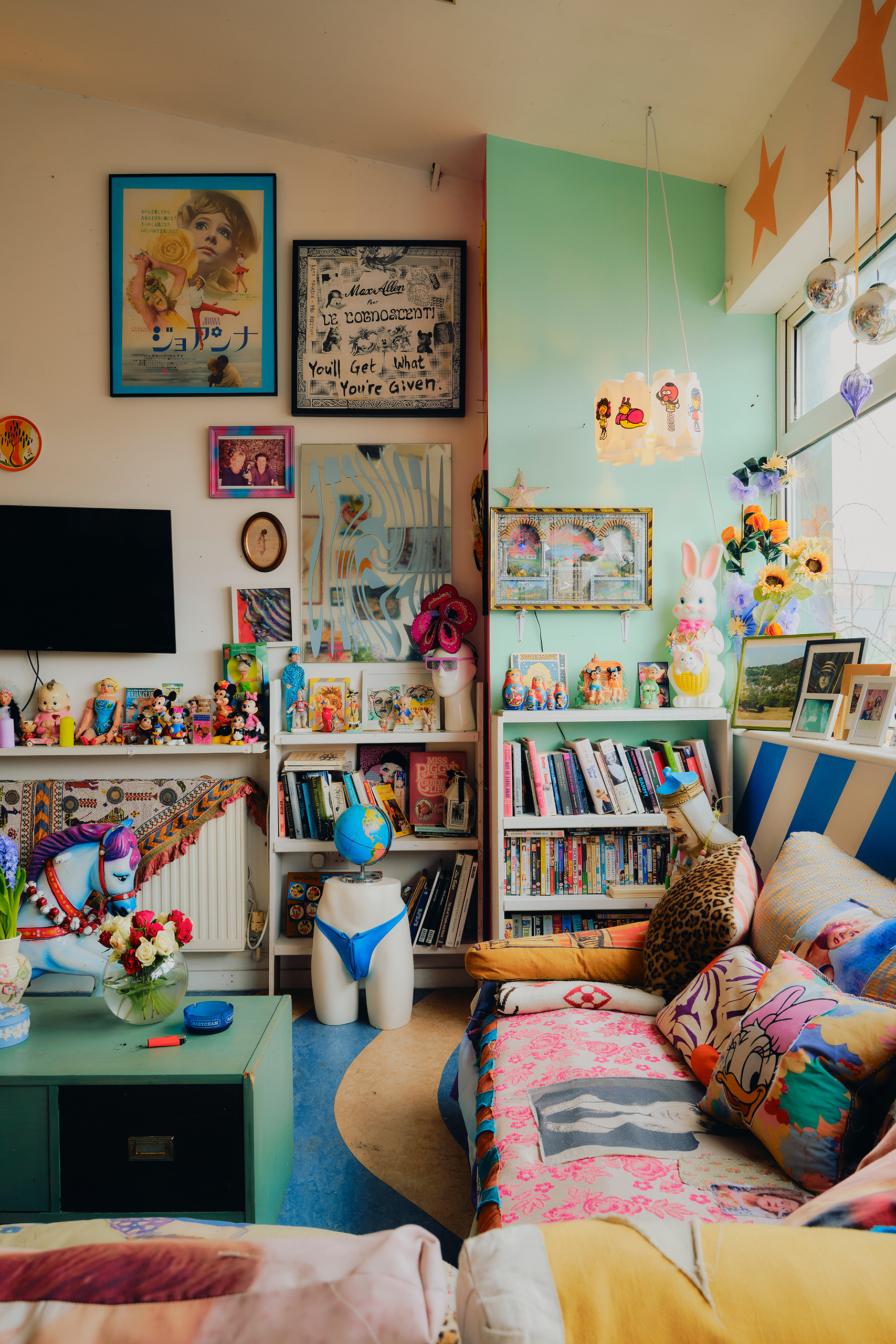 The shift is visible in the interior. “I think this is my first grown-up place,” he says. Until 2025, he lived in another warehouse in the same district, occupied by 10 people. He’d been there for a decade, turning it into a dense jewel-box of a space. By the end, he tells me, the walls had reached saturation point: layers of images, objects and experiments built up through time until they were almost sedimented. Here, less than a year in, the process has begun again, though this time a little more judiciously.