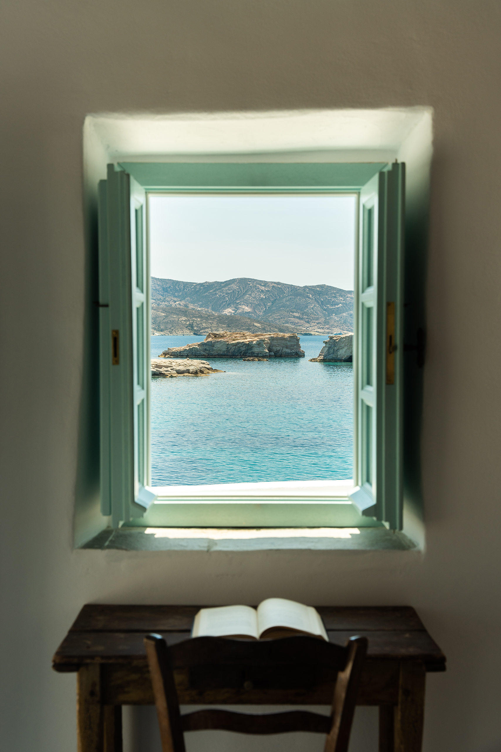 “For me, Kimolos is a hidden gem of the Cyclades, still untouched,” says Athenian entrepreneur Angelos Ismailos, who renovated a fisherman’s house last year at Kara-Goupa – one of the island’s striking rocky inlets – as part of his ongoing Thavma Cyclades project. “Thavma means miracle in Greek, and I think these fisherman’s houses are miracles,” explains Ismailos, who first came to Kimolos as a child with his family. As with each house in the growing collection (there are three more on Milos), Thavma Kimolos has been sensitively restored to honour its character. Original woven ceilings are intact, while fresh spearmint Cycladic-style doors open from each of the small rooms on to a vast, wraparound veranda revealing views of the island of Polyegos and the endless Aegean.