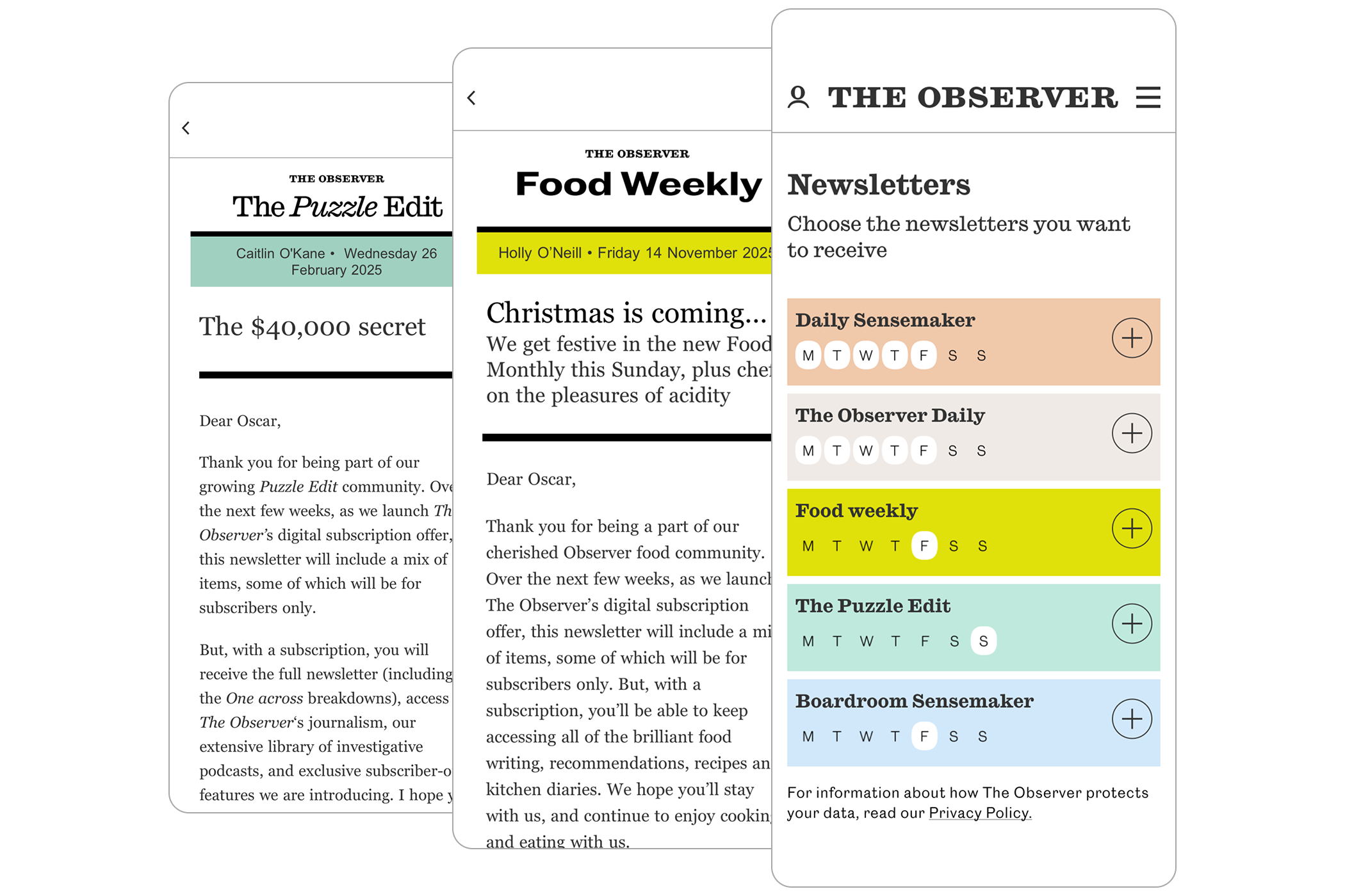 With your subscription you get unlimited access to all of our amazing newsletters, from The Puzzle Edit, to Observer Food Weekly and our award-winning Daily Sensemaker.