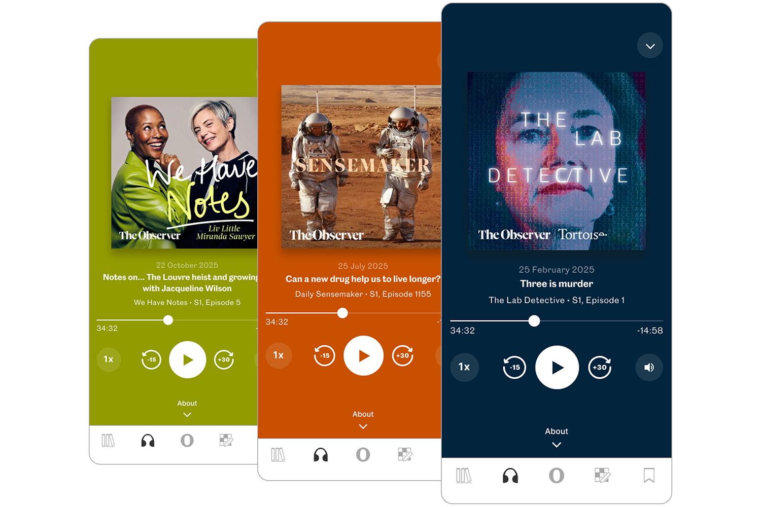 All of our award-winning podcast series are available any time, on demand, on observer.co.uk and in the Observer app