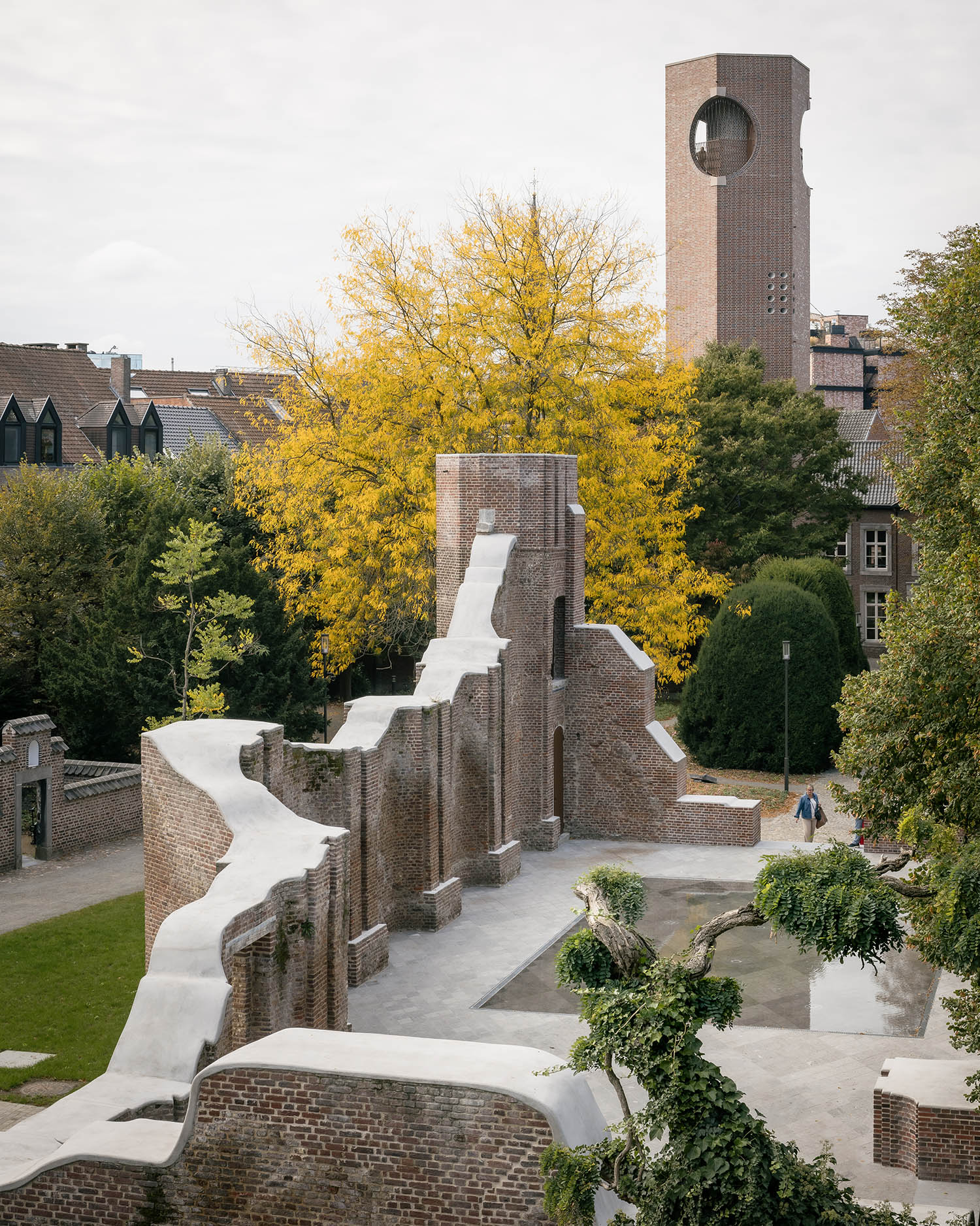 Then there is the tower, a work functionally speaking of pure redundancy, built in brick inside and outside to the same height as one that was once part of the church. It provides a viewing platform from which citizens can survey their city and creates a civic symbol; a statement of pride by the city and by the province of Limburg, which commissioned the project. It is, being a tower, direct and archetypal, but Kohn and Bovenbouw realise it with some obliqueness and mystery, a choice that is, in turn, part of a play of sophistication and ambiguity that runs through the whole site.