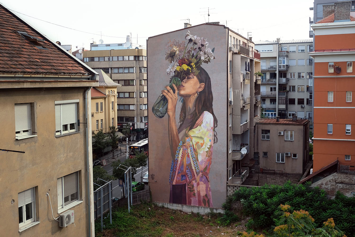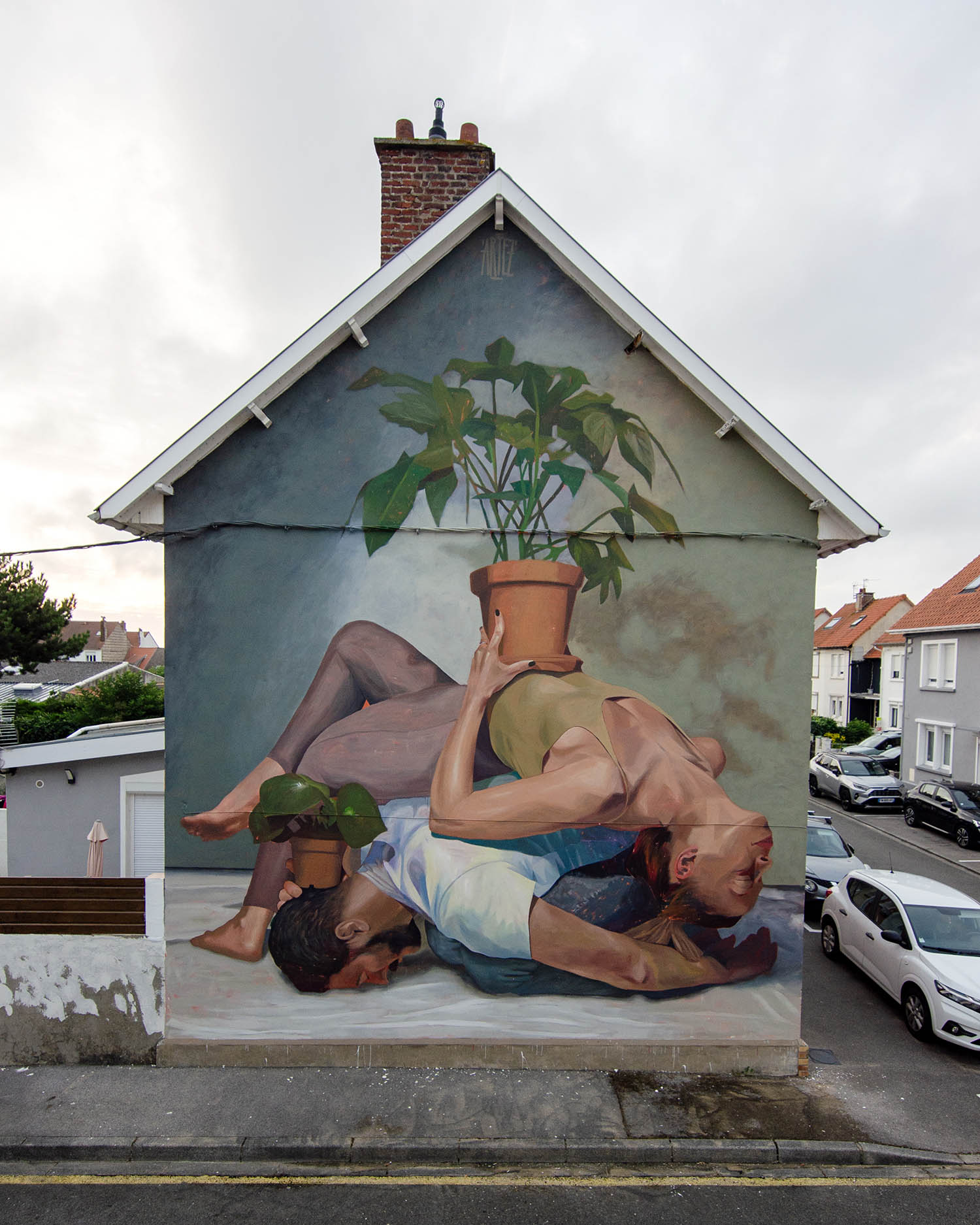In the Serbian street artist’s Simple Acrobatics series, which can be found all over the world, painted figures stretch out over chairs, hold one another as if in a dance or gaze out into the distance, contorting their bodies across the outer walls of buildings like giants on the horizon.