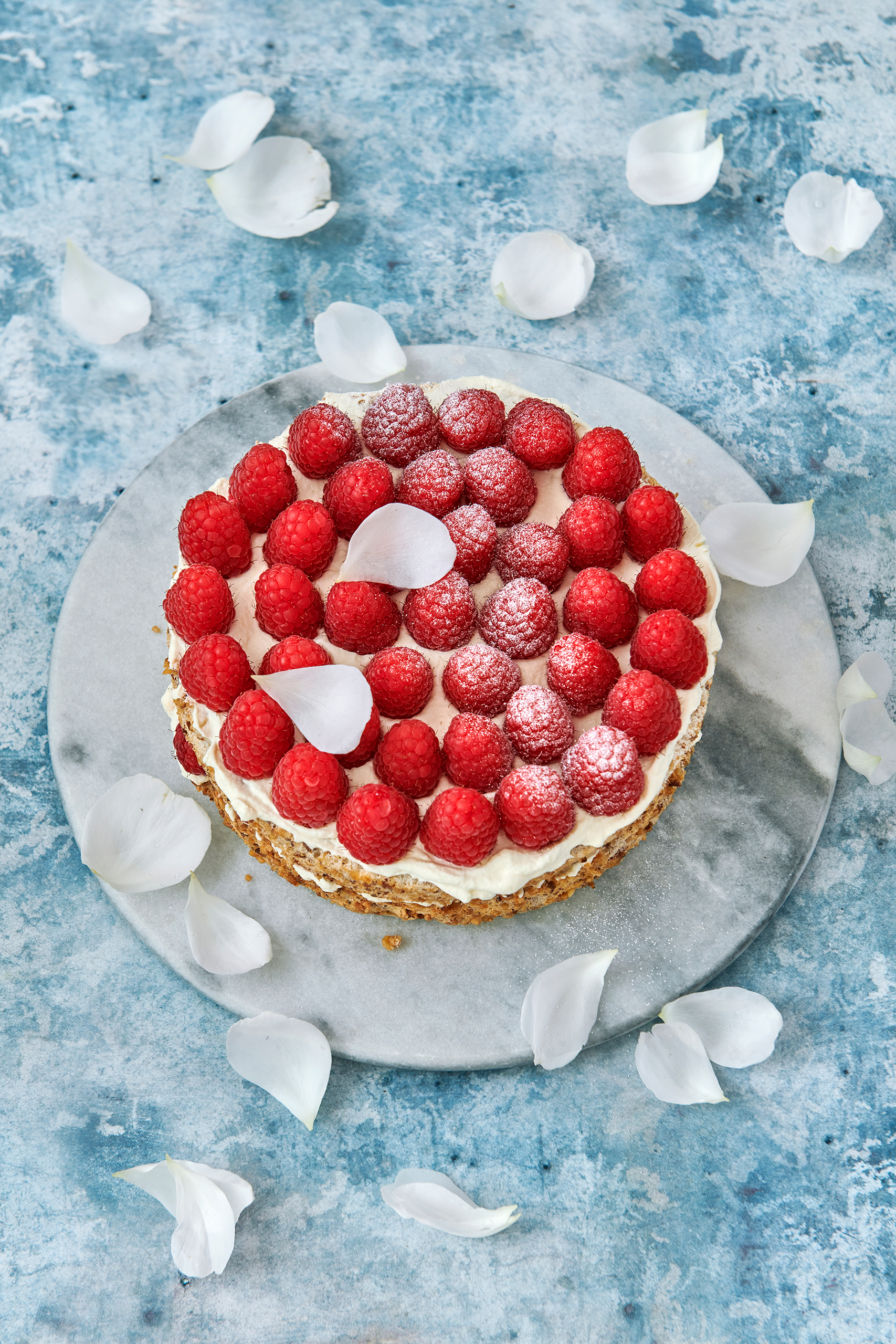 Spread the softly whipped cream on one side of the meringue and then arrange the raspberries on top making sure they are placed very close and snugly together. Lay the second meringue on top. Wrap in parchment or foil and gently place a weight evenly on top. Place in the fridge to chill for 2 hours before cutting and serving with a little extra cream and raspberries.