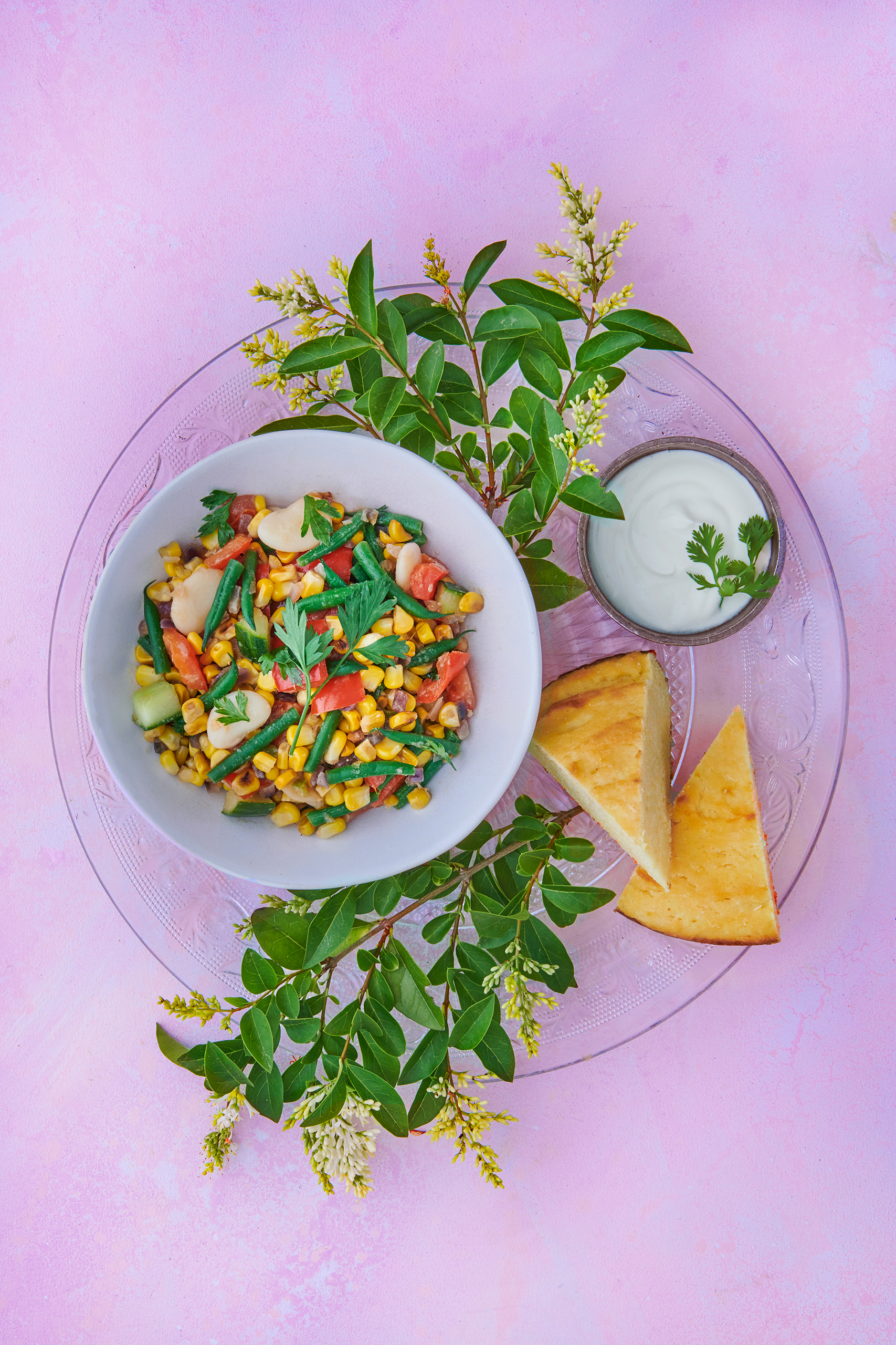 To make the succotash, place the olive oil in a large, heavy-based pan over a medium heat. Add the corn and a good pinch of sea salt. Cook, stirring every minute or so until the corn begins to turn golden on the edges, about 5 minutes. Turn the heat down to medium-low and add the onion, chilli, red pepper and another good pinch of salt. Stir well to combine and cook for a further 5 minutes or until the onion has begun to soften. Now add the garlic, butter beans, cucumber and green beans, and cook – just to warm through. Finally, turn up the heat slightly and add the chopped tomato, butter, lime, herbs and cayenne. Stir really well – the butter will give a lovely, slightly creamy texture. Check for seasoning, spoon into warm bowls, adding a tablespoon of sour cream to each one, and serve alongside the cornbread.