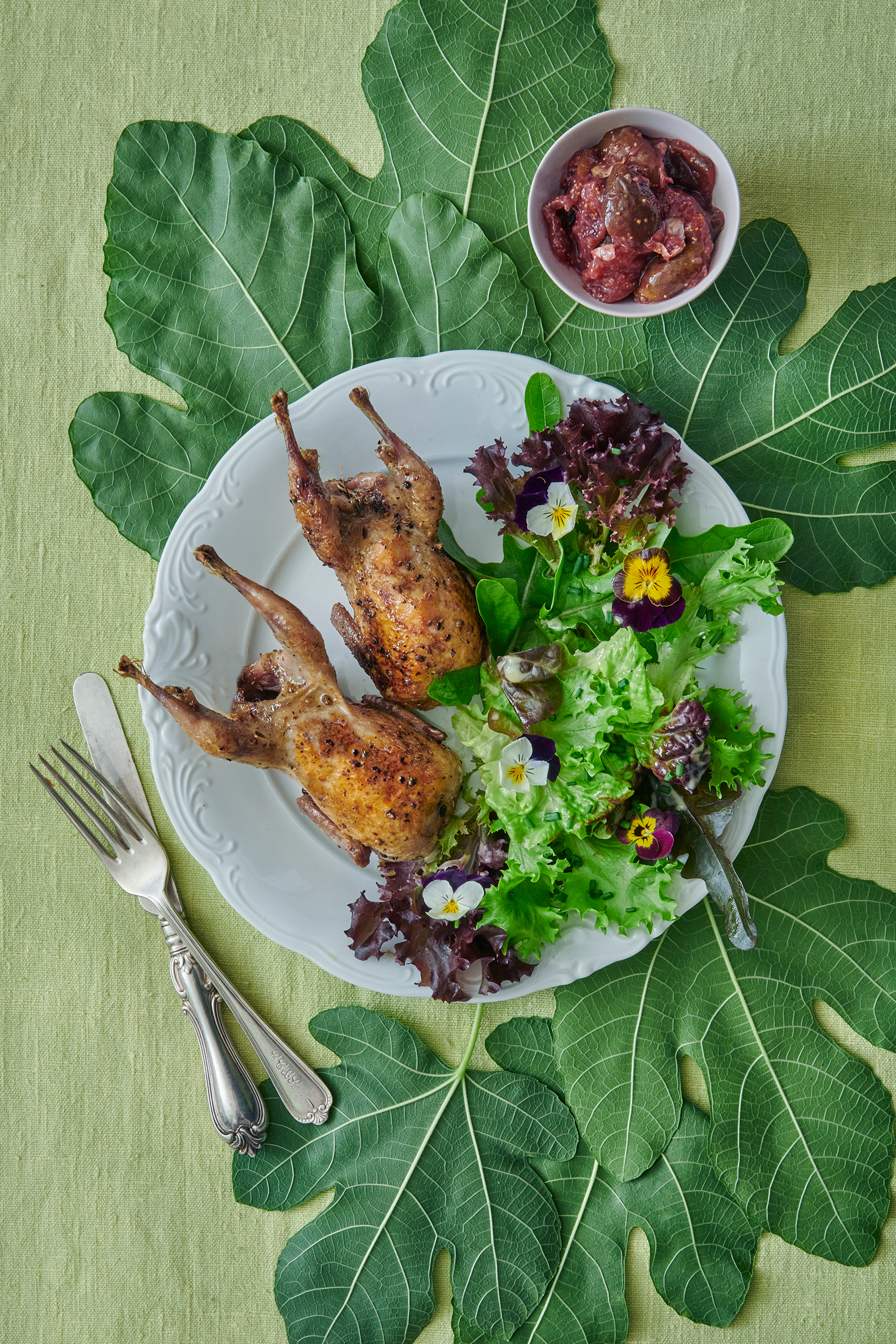 Quail is a versatile bird that absorbs flavour beautifully. Here the gently spiced and well seasoned skin works really well with the sweet fig jam. Allow two birds per person.