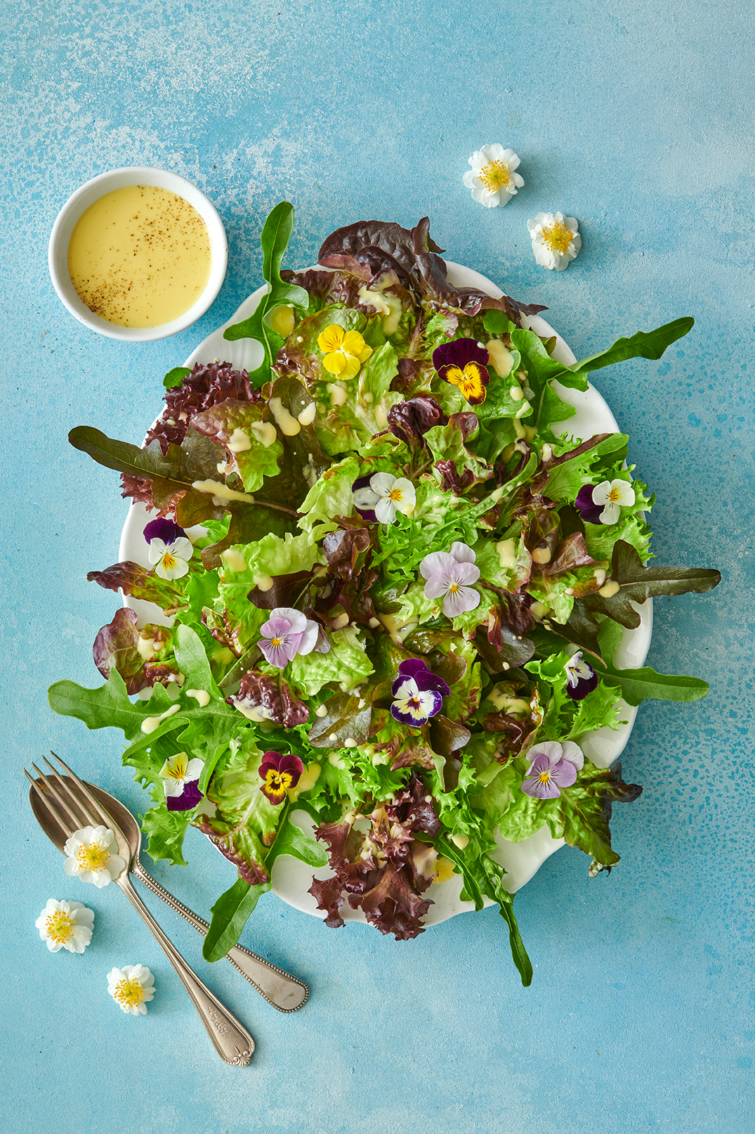 Separate the leaves, wash and pat dry. Place in a bowl large enough to comfortably hold and dress them, scatter over the herbs and petals. Drizzle over a little olive oil and squeeze over a few drops of lemon juice (just for brightness rather than acidity). Season with salt and a little freshly ground black pepper, and toss together using clean fingers.