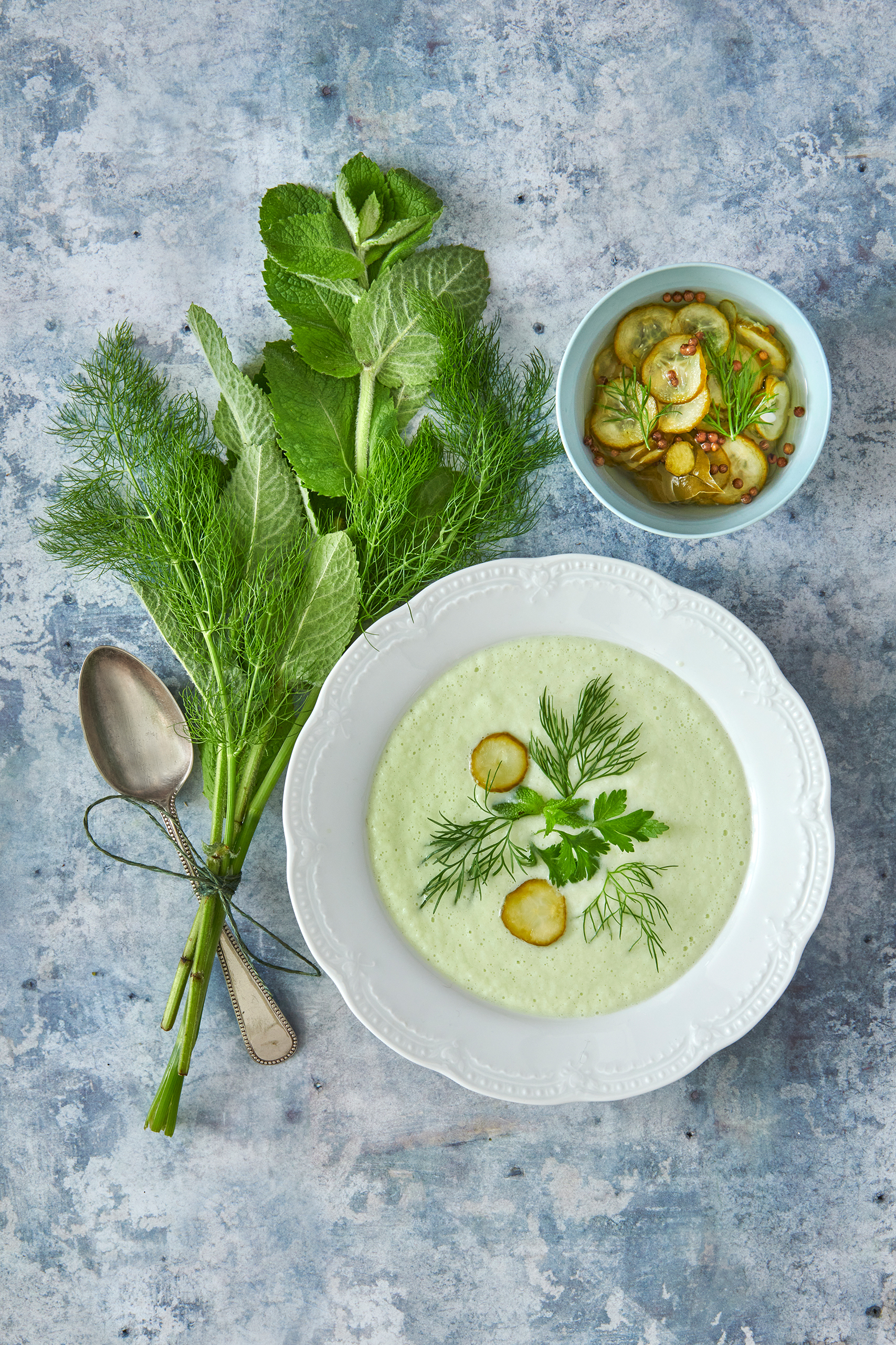 Serve in the chilled soup plates with a spoonful of pickled cucumber, if using. Scatter the herbs over the top and finish with a drizzle of extra virgin olive oil.