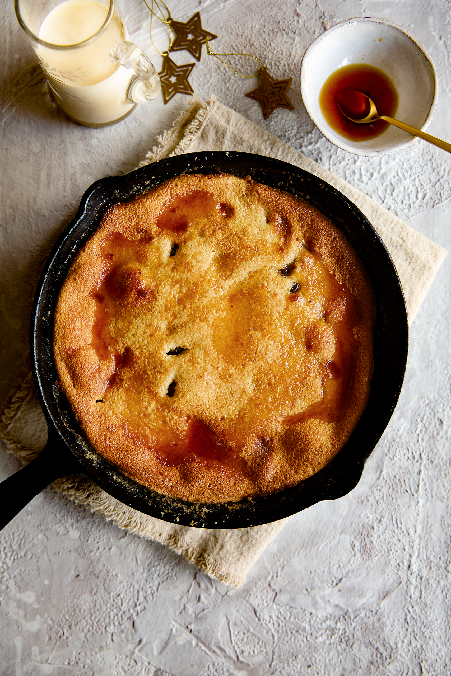 Clafoutis is overlooked as a winter dessert. However, I believe it’s a perfect pudding to serve over Christmas and it can be very festive. It’s simple and the batter can be made days in advance, but the result is indulgent and impressive. You will always find a variation on our menu at Gloriosa. This one is made with brandy-soaked prunes and hazelnuts, and served hot from the oven with lots of pouring cream.