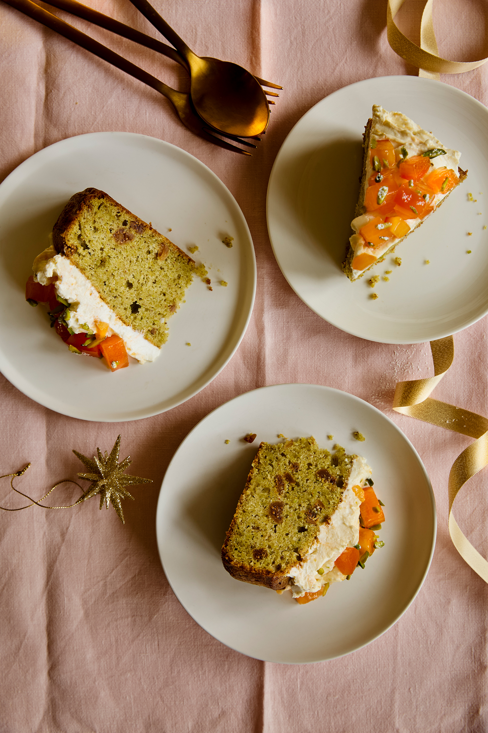 FIG AND PISTACHIO CAKE WITH PERSIMMON, ORANGE, MASCARPONE AND OLIVE OIL