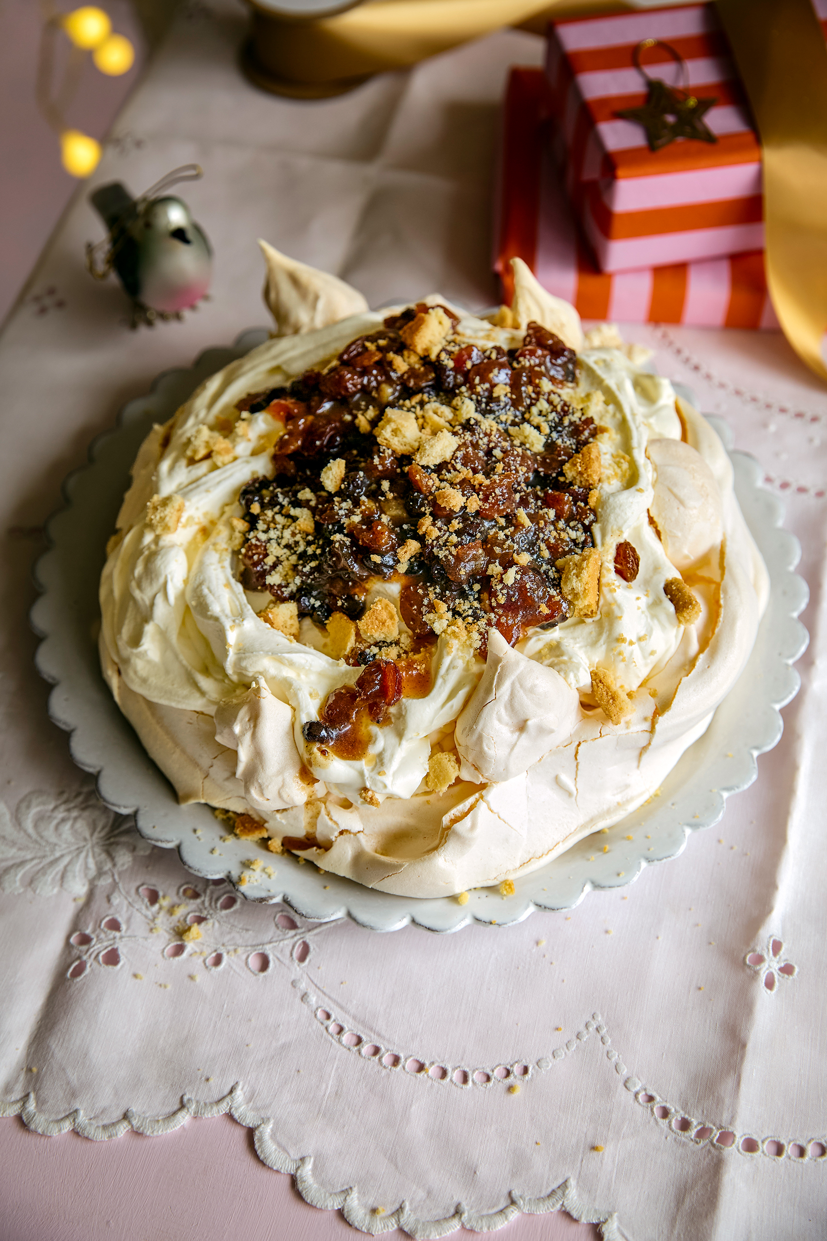 MINCE PIE PAVLOVA WITH SHERRY CREAM AND SHORTBREAD CRUMBLE
