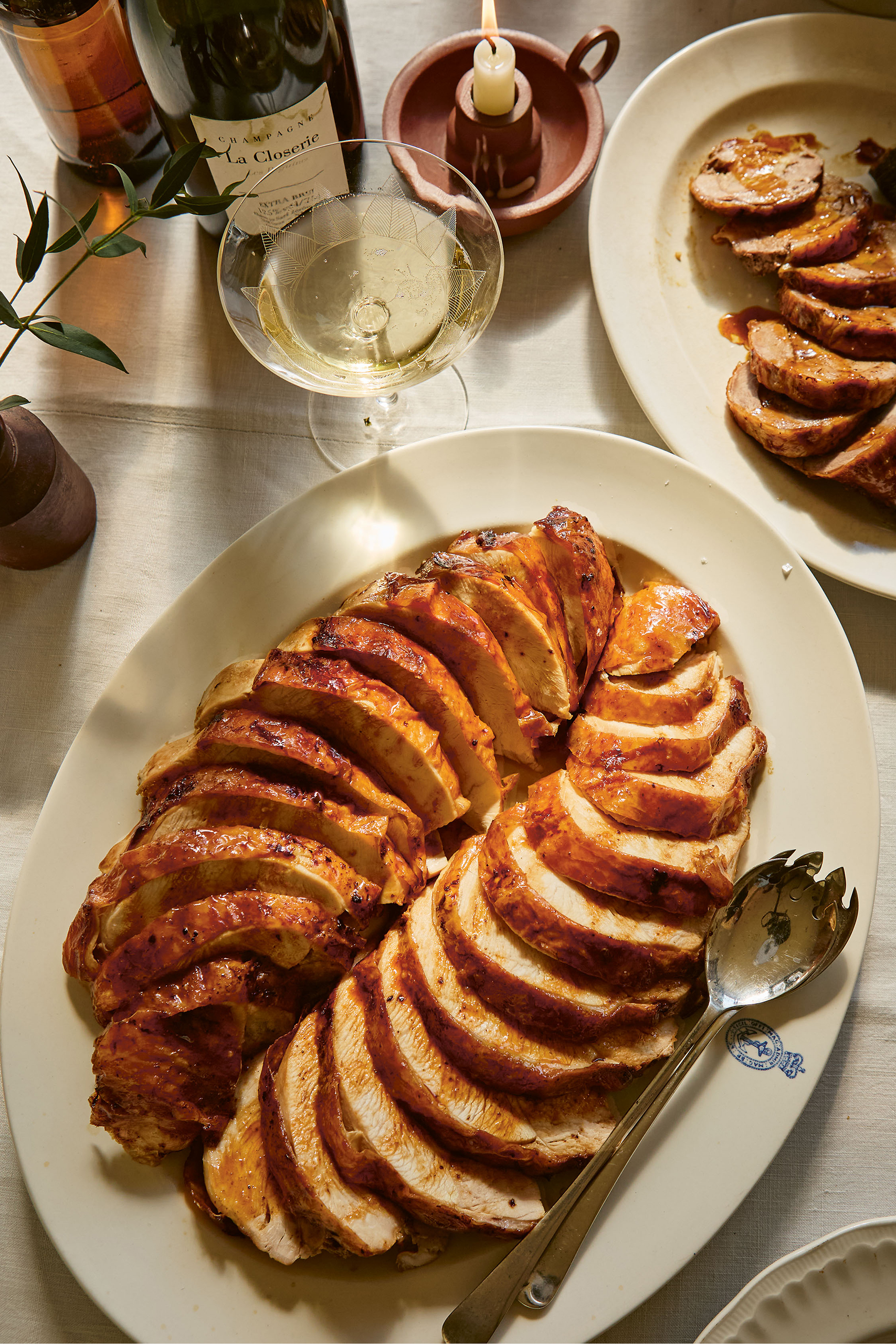 Buy the size of turkey that your butcher recommends for the number of people that you are cooking for. I usually get a 5.4-6.4kg bird for eight people. Ask them to break the turkey down into the crown (this is the breasts on the bone, with the wishbone removed), two boned legs and the wing tips and ribcage for stock.