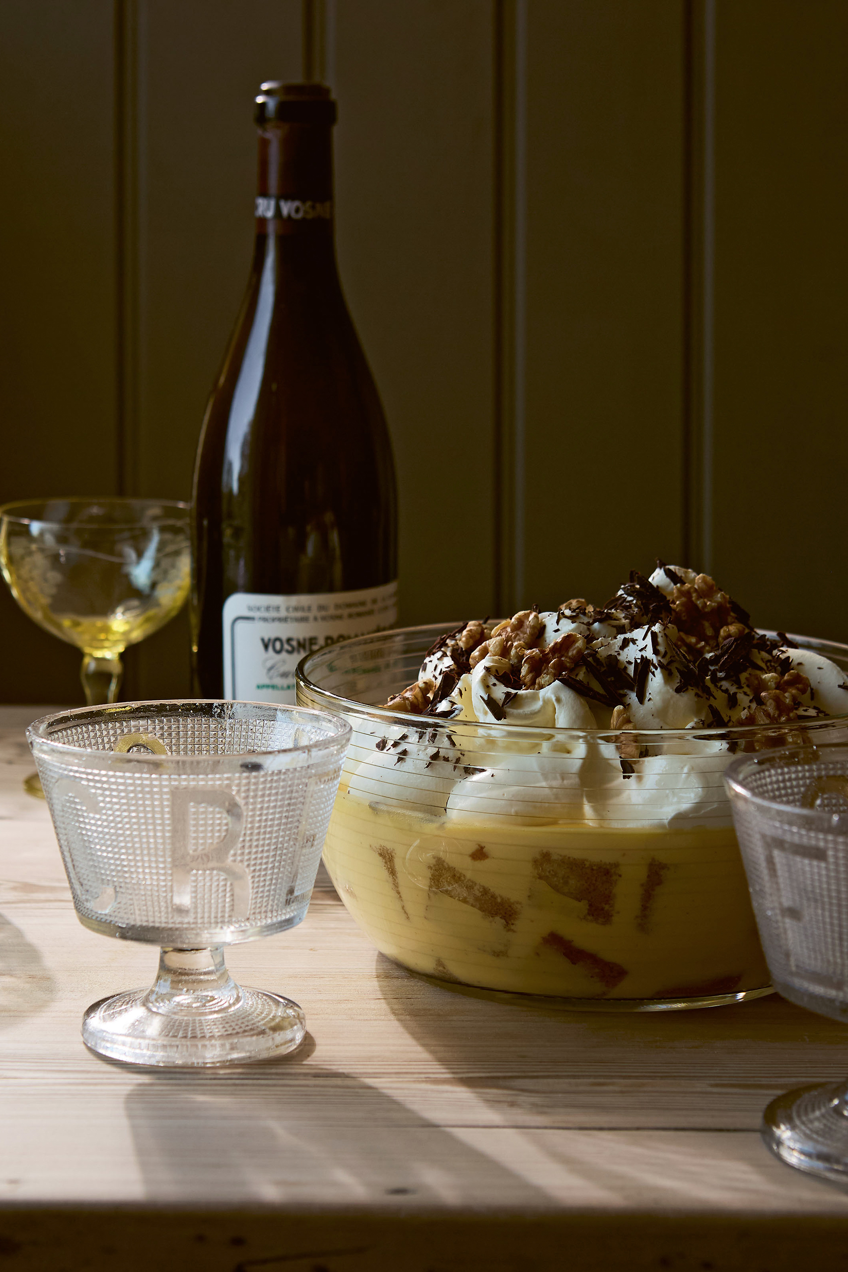 Break the madeira cake into pieces and place it in the bottom of a trifle bowl. Drizzle over 3 tbsp each of the coffee and whisky and leave to absorb.