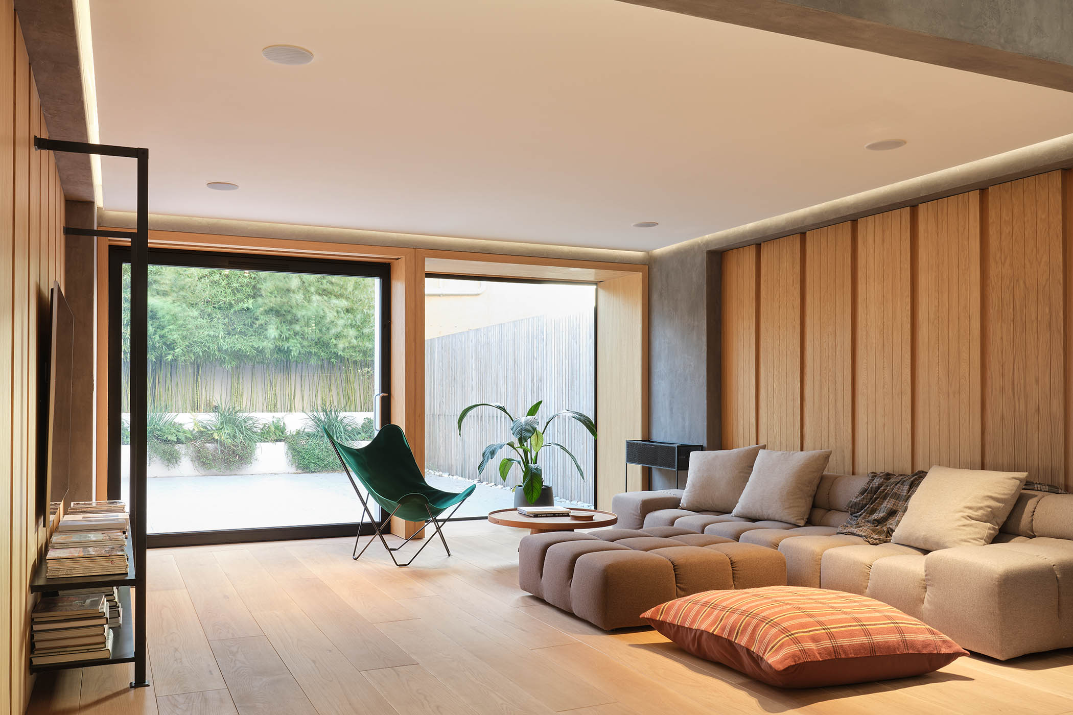 Despite that consistency, different spaces have different atmospheres. In the downstairs living room, the walls are lined with oak, which risked pushing that warmth to its limits. (“You don’t want it to end up looking like a sauna,” says Cassidy.) To avoid this, a series of grooves were added. “That elevates it, makes it more contemporary, and draws your eye to the rhythm,” says Edgley.